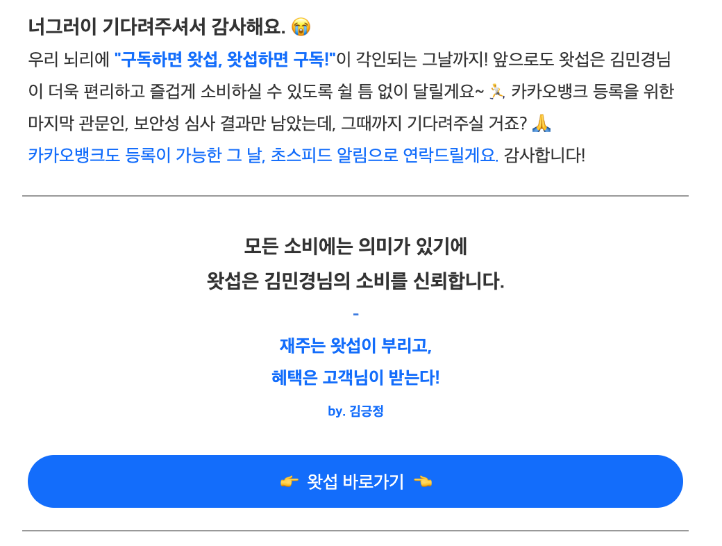 그로부터 몇 주 후, 최근 왓섭에서 카카오 뱅크 등록을 위한 마지막 관문인 보안성 심사 결과를 앞두고 있다는 뉴스레터를 전했다. 찬찬히 읽다 마지막에 내가 쓴 카피를 발견했다! 그 때 위워크에서 저 카피가 마음에 든다고 하셔서 내가 써달라고 했다. 근데 이게 뭐라고 뉴스레터인데 러브레터 마냥 설레는지,, (왓섭 못 잃어,, 질-척,,) 끝으로 정말 편하고 좋은 서비스라 많은 분들이 한번 이용해보셨으면 좋겠다!