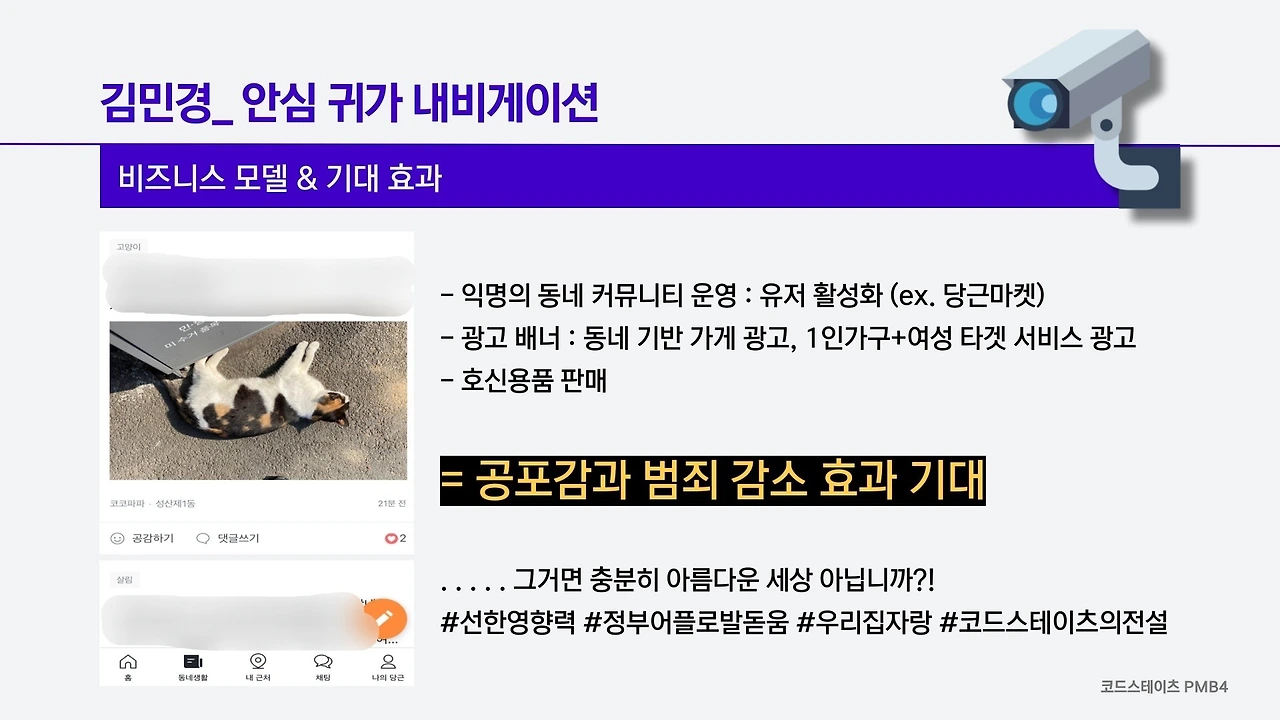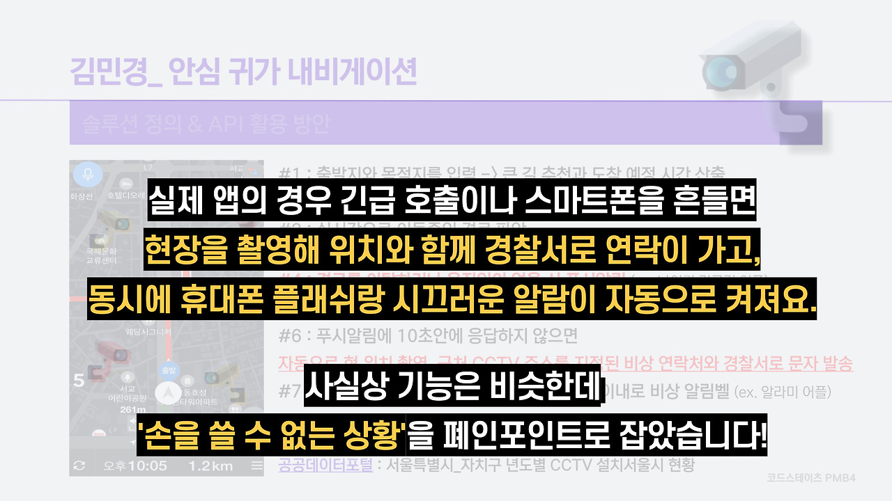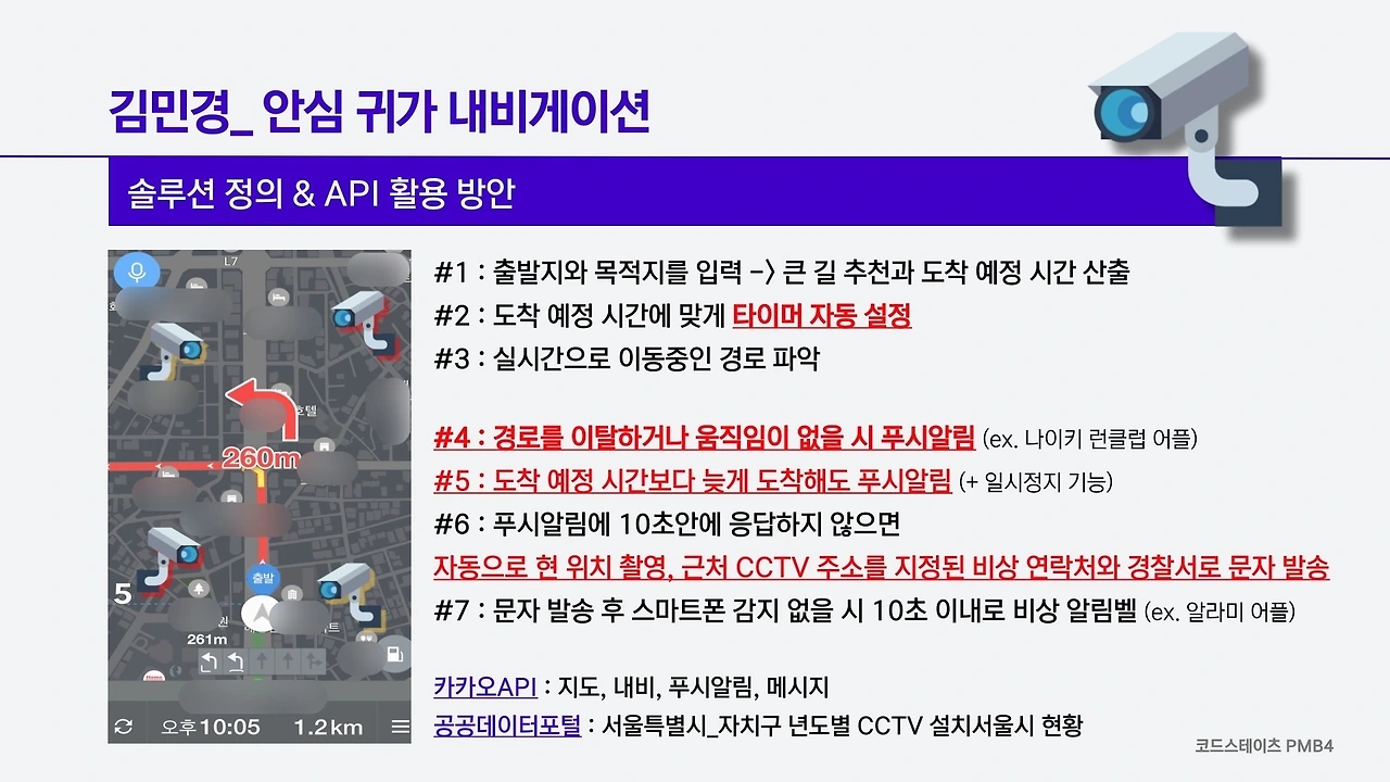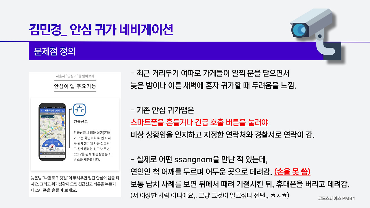 나는 [안심 귀가 내비게이션]을 기획했다. SBS 그것이 알고 싶다의 애청자라 미제사건에 관심이 많고, 최근에 지하주차장에서 고가의 차량을 운전하는 여성만 노린 범죄자가 붙잡힌 뉴스를 보고 마음이 많이 쓰였다. 그래서 평소에 갖고 있던 불안함과 불편함을 해소하는 서비스를 기획했고, 우리 팀 수지님과 함께 ssangnom들을 욕하며 1차 발표를 마무리했다.