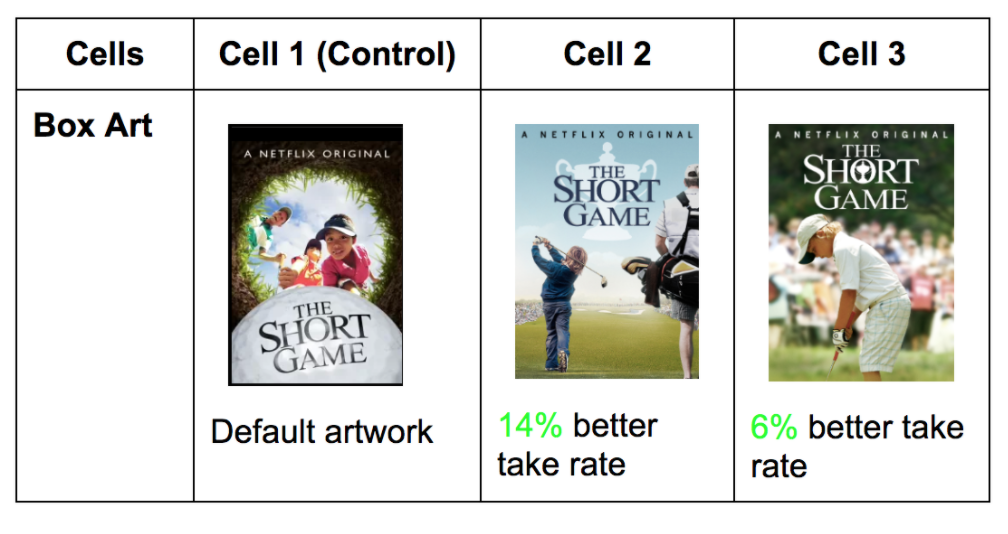 넷플릭스의 초기 A/B 테스트 중 하나는 영화 [The Shorts]로 골프 게임에서 서로 경쟁하는 어린이들이 영감을 주는 스토리다. 기존 이미지(Cell 1_Control)로는 어린이에 관한 내용이라는 것을 인지하지 못하고 쉽게 지나칠 수 있다는 판단하에 Cell 2, 3번의 고객들에게 해당 이미지로 실험, 각각 14%, 6% 더 높은 클릭률을 기록했다.