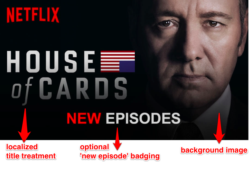 : 배경 이미지 + 현지화된 타이틀 처리 + ‘새로운 에피소드’ 배지(선택) + 넷플릭스 로고(콘텐츠 별 상이)