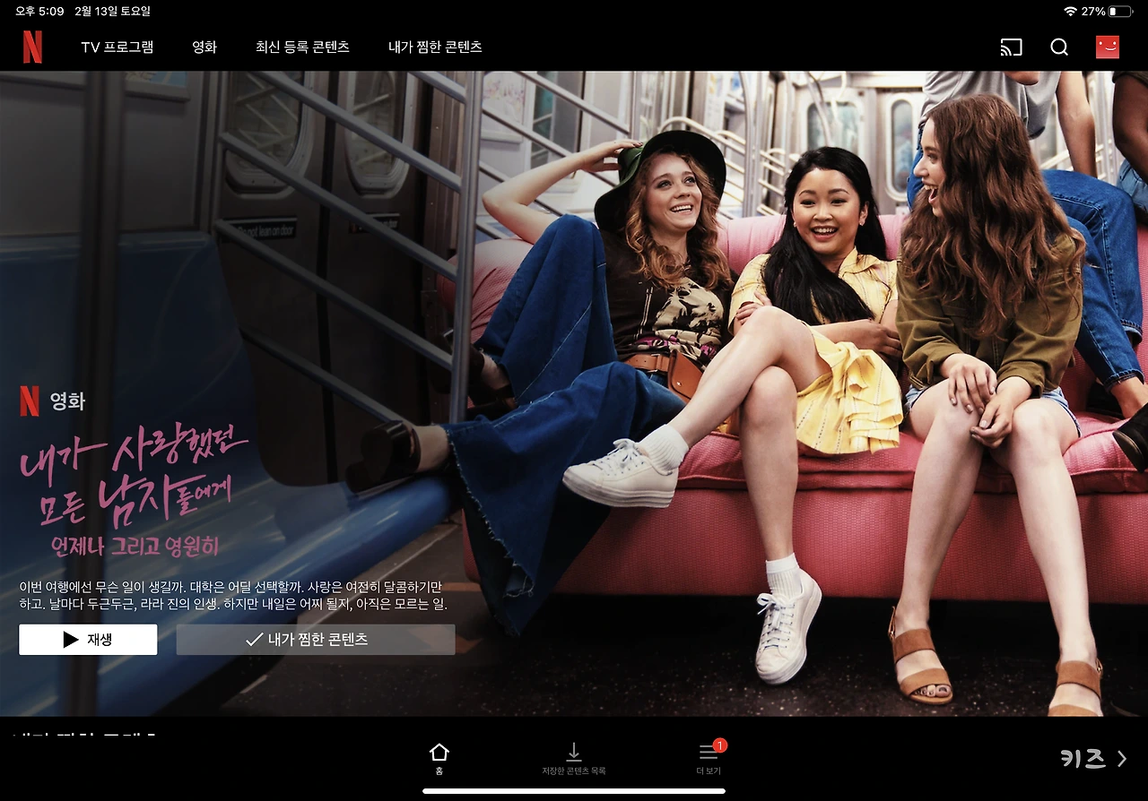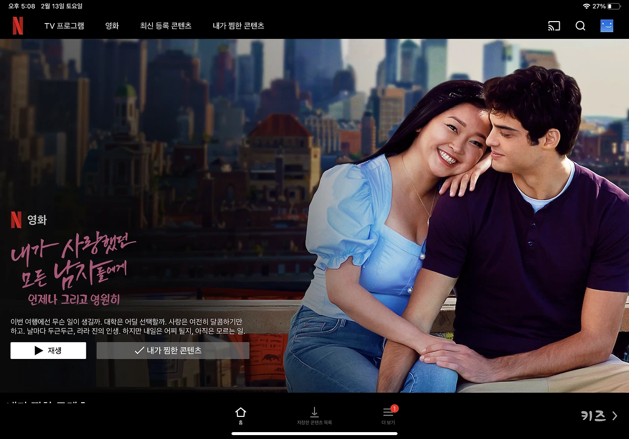 넷플릭스 오리지널 [내가 사랑했던 모든 남자들에게]의 시즌3 [언제나 그리고 영원히]가 개봉되었다. 특히 이번 시리즈는 라라진이 설 연휴를 맞아 한국으로 여행을 온 설정이라 더 호기심이 갔다. 처음에는 왼쪽 빨간색 프로필인 내 계정으로 들어가 영화를 보았다. 그러다 저녁을 먹기 위해 껐다가 다시 넷플릭스를 켰고, 실수로 우측의 파란색 프로필인 내 동생의 계정으로 들어가게 되었다. 캡처 날짜를 보면 알겠지만 개봉한 바로 다음 날이라 넷플릭스에서 해당 영화를 전면에 내세워 공격적으로 광고하고 있었다.