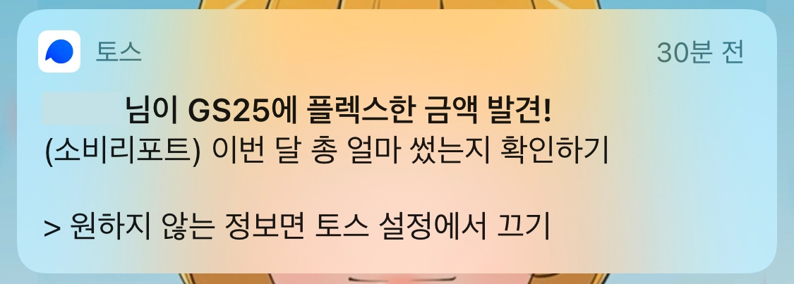 토스처럼 실제로 많이 썼던 내역이나 특정 가게명을 콕! 짚어주는 것도 좋지만, 매일 오는 푸시라면 부담스러울 수 있다. 내가 생각하는 푸시 알림은 서비스가 고객에게 먼저 건네는 대화다. 가끔은 맞춤 데이터가 그동안 나를 감시하고 있었다는 기분이 들어 찝찝할 때가 있다. 위의 토스 사례를 예로 들면, 갑자기 누가 "너 최근에 GS25에서 돈 많이 썼더라?"라고 카톡 온 느낌이랄까. 요즘 맞춤 푸시 마케팅 광고를 자주 접하는데, 나는 이가 능사는 아니라고 생각한다.
