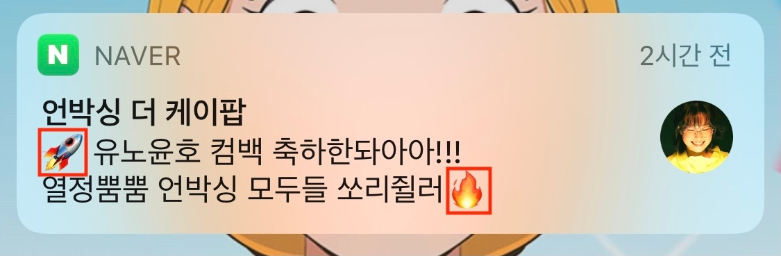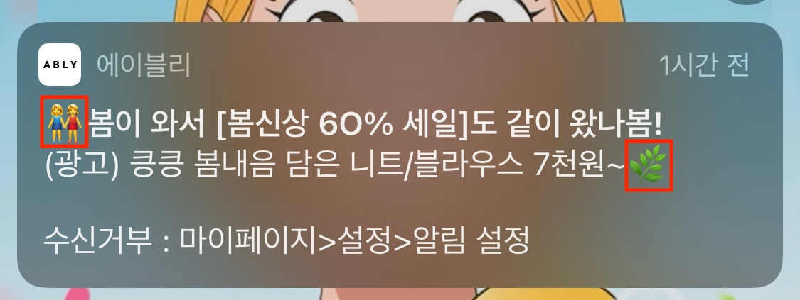 그리고 나는 푸시 알람 이모지를 해당 내용의 브랜딩을 위해 사용한다. 당시 콘텐츠 내용이 '유노윤호의 컴백'이기 때문에 그의 유행어인 축하한돠아아!!를 인용, 열정 캐릭터에 맞춰 로켓과 불 같은 이모지를 담았다. 이런 측면에서 에이블리도 봄 느낌이 나는 블라우스나 꽃으로 이모지를 넣었으면 더 좋았을 것 같다. 참고로 에이블리처럼 계절성 있는 카피를 내세우는 것도 클릭을 부르는 좋은 방법이다.