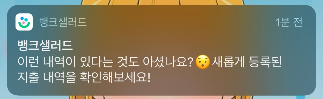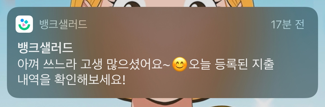 평소 뱅크샐러드의 가계부 확인 푸시 알림 카피에 아쉬움을 느끼기도 했고, 이번주에 한 회사의 UX Writer 채용에 떨어졌다.. ^^.. 그래서 내 브런치에서라도 못다한 카피의 한을 풀려한다. (누구나 마음속에 카피라이터 꿈 하나쯤은 품고 있잖아요?)