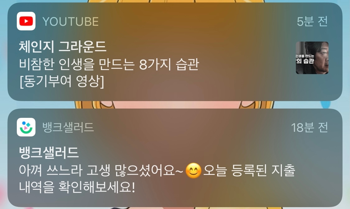 비교하기 쉽게 유튜브를 예시로 준비했다. 별 것 아닌 것 같아 보여도 수많은 푸시 알림과 재난문자 사이에서 썸네일이 있고 없고는 분명한 차이가 있다. 심지어 뱅크샐러드는 주로 저녁에 발행되기 때문에 유튜브 푸시 알림에 쉽게 파묻힌다. 매일 발행되는 푸시보다는 다른 이슈가 있을 때, 언젠간 저렇게 썸네일을 활용하면 좋을 것 같다 :')