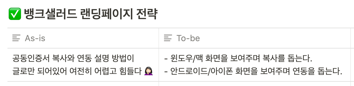 우선 네이버에 '뱅크샐러드'를 검색하면 공식 홈페이지가 먼저 나온다. 내가 바꿨던 건 랜딩페이지로 CTA 버튼은 [앱 다운], [공동인증서 복사], [보안정책], [가계부 PC버전] 총 4개가 포함되어 있다. 당시 분석하며 느낀 점은 랜딩페이지를 다 읽게 유도하는 것도, 앱 다운이나 웹으로 유도하는 것도 아닌, 그저 PC에서 앱으로 공동인증서를 잘 복사하고 연동할 수 있게 돕는 것이 랜딩페이지의 가장 중요한 역할로 보였다.