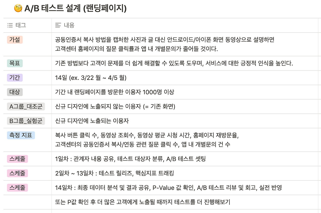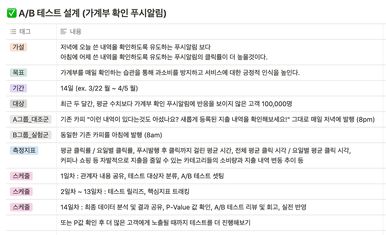 사실 나는 데이터가 전혀 없어서 대상 모수와 아침 8시라는 정확한 시간, 지표 등이 마음에 들지 않는다. 그래도 뱅크샐러드의 테크 블로그에 자료가 많아 비슷한 실험 속 내용을 참고해 설계해 보았다 :')