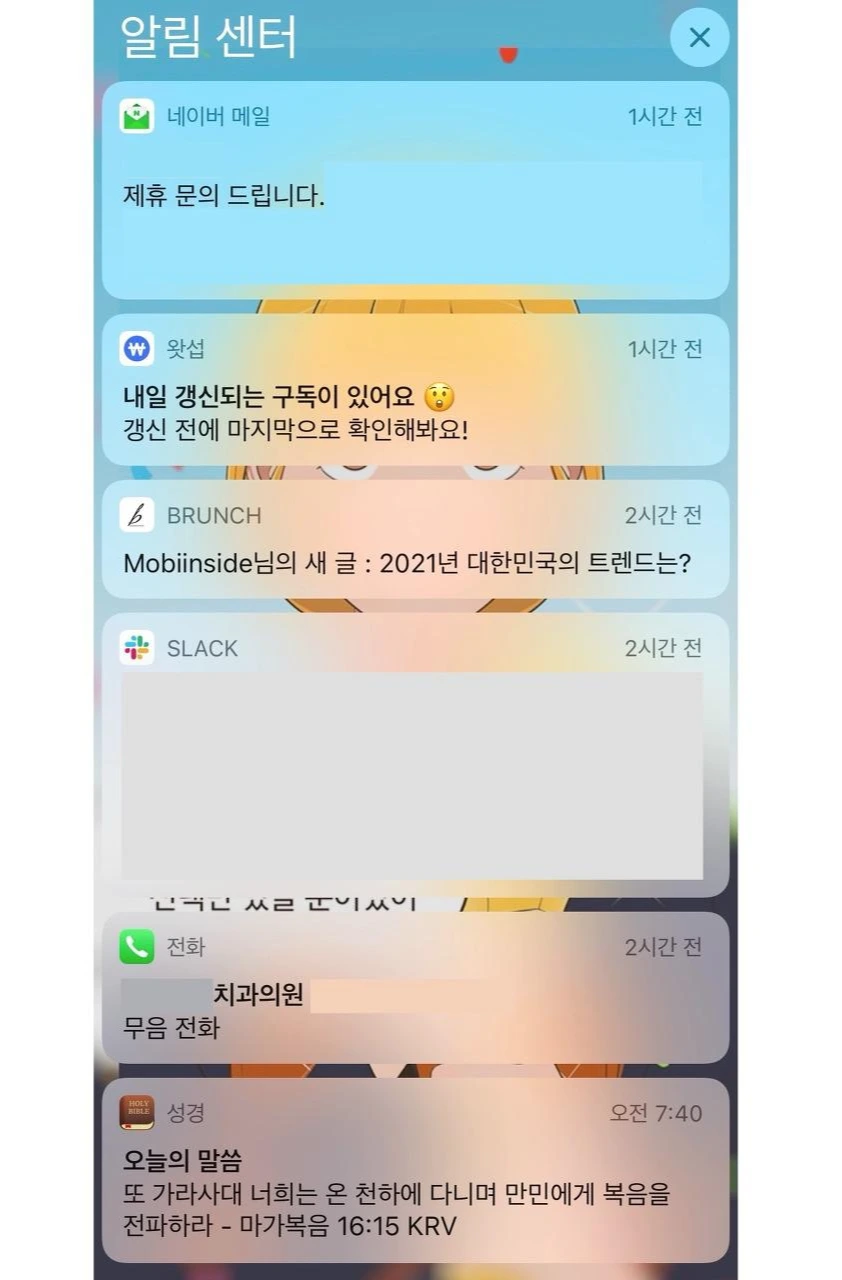 나의 경우 [브런치 제휴 문의 메일], [결제를 앞둔 구독 내역 확인], [올해 트렌드를 알려주는 콘텐츠], [단체 공지 슬랙], [치과에서 온 부재중 전화], [오늘의 성경말씀]이 도착해있다.