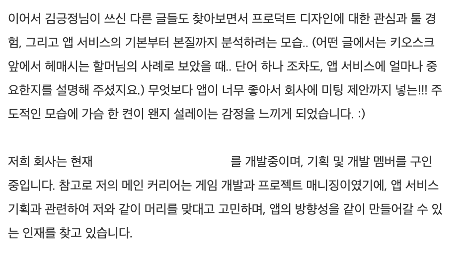 방금 쓴 이 한 줄은 정말 자신있게 말할 수 있다. 이력서나 자소서도 내지 않고 바로 면접까지 볼 수 있었다. 그런데 나는 주어진 분석 과제에 그치지 않고 카피와 UX/UI를 리디자인 했고, 원래 주어진 양보다 훨씬 더 많은 글들을 남겼다. 또 내가 먼저 주도적으로 회사에 메일을 보내기도 했다. 사실 코드스테이츠 교육에 성실히 임하는 것만으로도 벅찬데, 나는 3개월 동안 굉장히 나를 많이 밀어붙였다. 그리고 이러한 방법을 남들에게 추천하고 싶진 않다. 나는 운이 좋았을 뿐이고, 무언가를 바라고 이렇게 한다면 너무나도 힘들 것 같다. 이 얘기는 하단에 좀 더 길게 남기려 한다. 어쨌거나 취업은 아직 정해진 바가 없어서, 이번 회고에는 편하게 서비스 기획이나 스타트업 얘기를 나눌 수 있는 인연들을 만난 이야기를 담으려 한다 :')