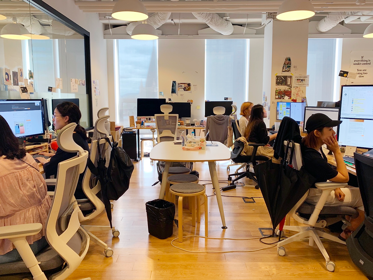 매니저님께 손 잡고 다니면 안되냐고 물어볼 정도로 사무실이 빙글뱅글 복잡했다 (ㅠㅋㅋㅋ) 길 잃으면 노래 부르는 움파룸파족한테 잡혀갈 것 같음.. 건물 자체가 독특한 구조기도 했고, 책상 배열도 특이했다. 파티션 없이 모여있는 형태라 이야기를 나누기 편해 보였다. 서서 일할 수 있게 책상을 조절하는 분도 계셨다.