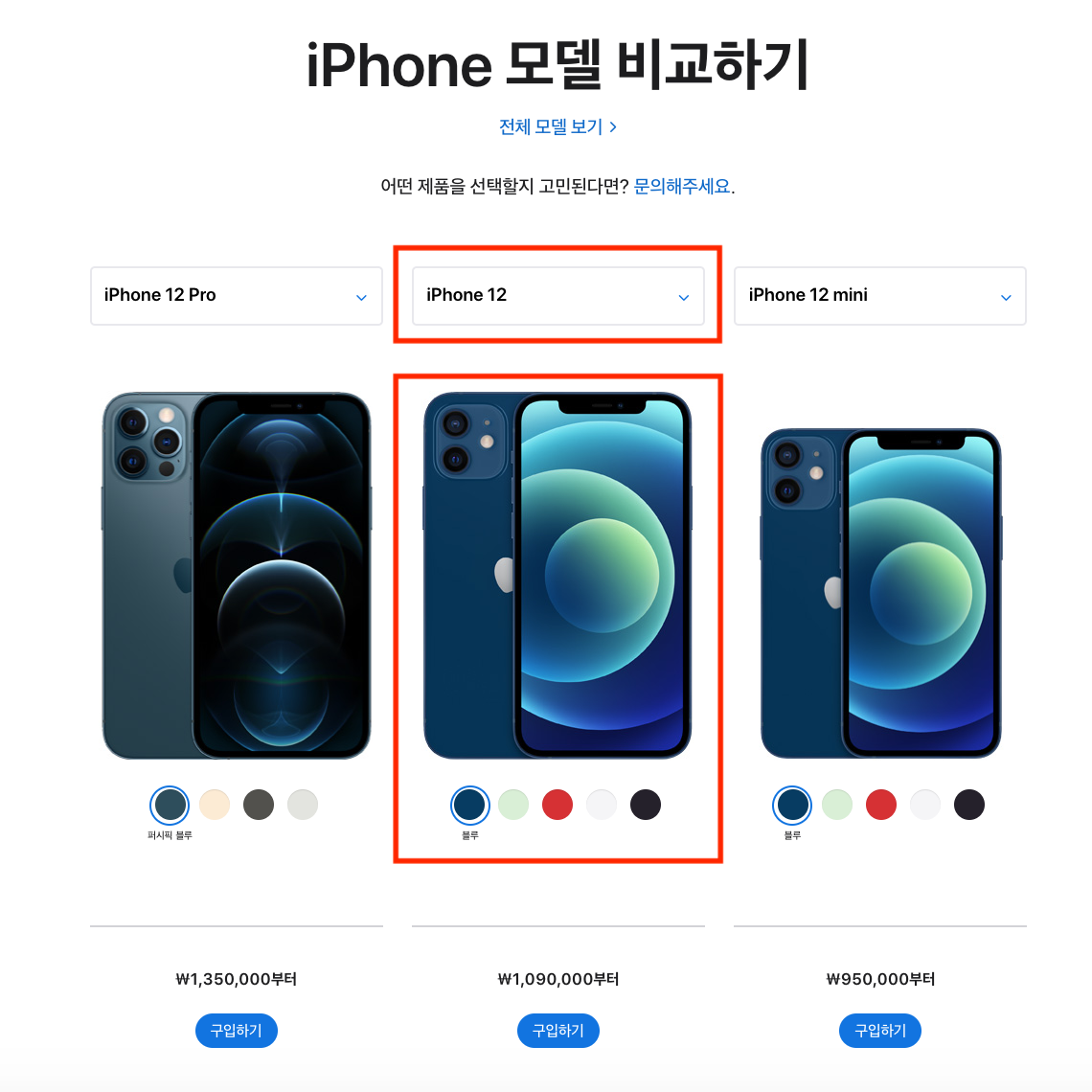 애플은 iPhone 12라고 자동으로 모델명이 명시되고, 삼성은 "모델을 선택해 주세요."라고 말한다. 그러면 당연히! 어? 그냥 그런가보다 하지 (ㅠㅋㅋㅋ) 애플의 경우 연한 실선의 박스에 모델명이 담겨있기 때문에 하나의 형태 같다. 그래서 아래로 향하는 화살표가 되려 눈에 안 띈다는 느낌을 받았다. 반면 삼성은 밑줄로 표현해두어 좀 더 강조되는 느낌이 들었다.