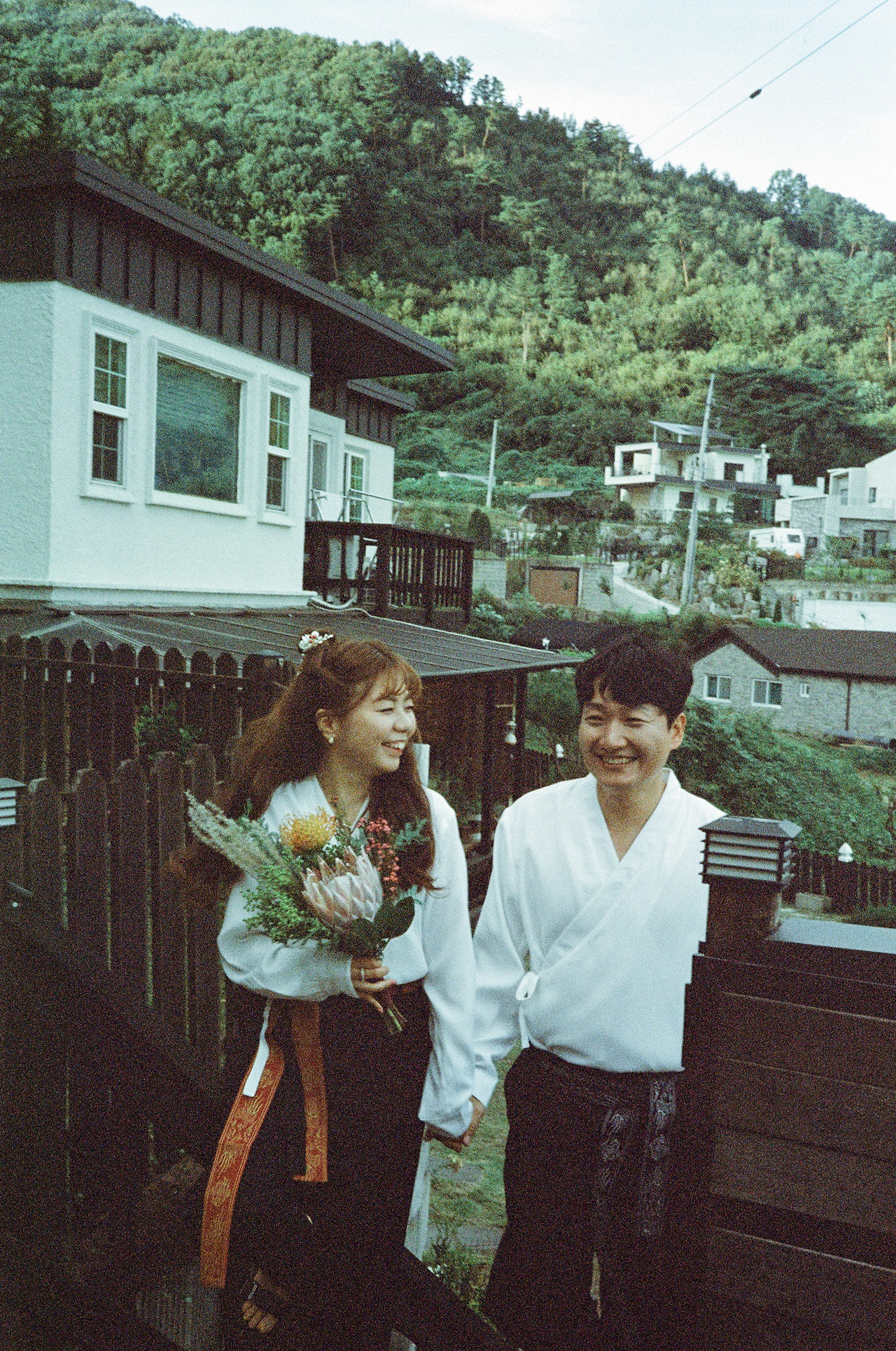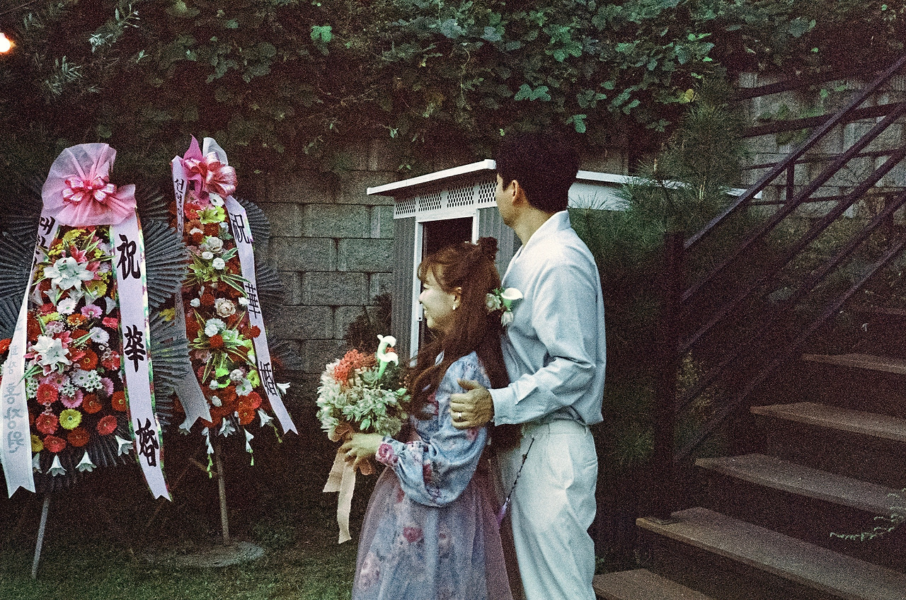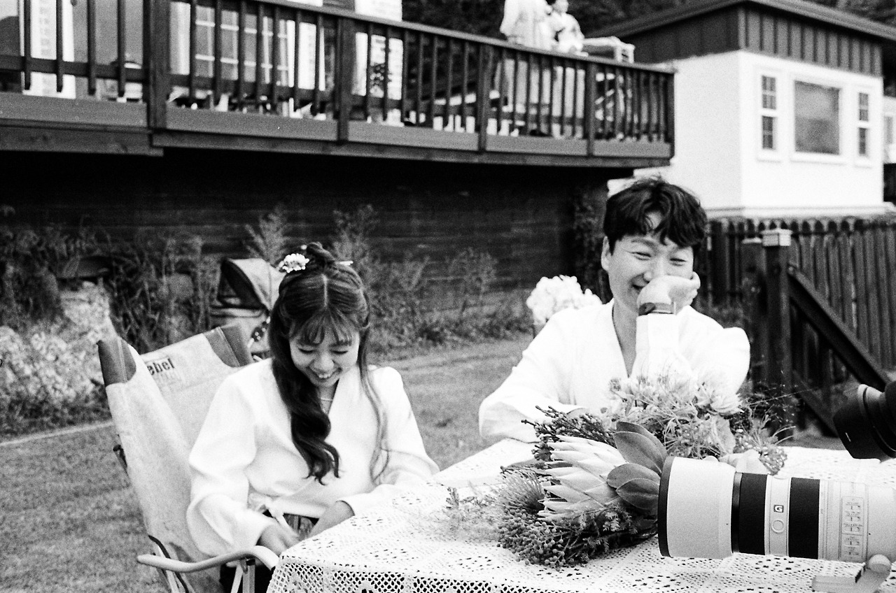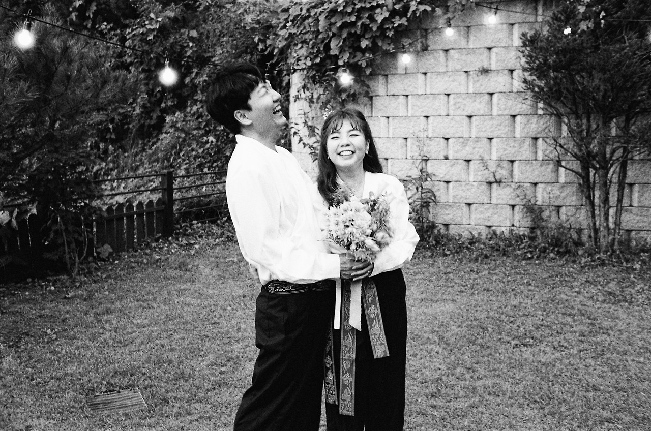 '남들 다 하는 거 하기 싫어병'이 극심한 저희 부부. 전형적인 웨딩드레스와 턱시도도 입지 않았어요. 왜 결혼식엔 흰색 드레스를 꼭 입어야 하는지도 모르겠고, 어차피 격식 없이 하는 거 의상도 저희 마음대로 했죠. 저는 자수가 새겨진 소라색 한복을, 남편도 그에 조화를 맞춘 컬러톤의 캐주얼한 한복으로 준비했습니다. 웨딩케이크 역시 하얀 생크림 케이크가 아닌, 이사 오기 전 제가 자주 가던 단골 케이크집에서 제 취향에 딱 맞춘 빈티지 케이크로 부탁했어요. 부케도 빈티지면 깜빡 죽는 제 취향을 익히 잘 아시는 단골 꽃집 사장님에게 의뢰하여 '이게 부케라고?' 싶은 유니크한 꽃들로 조합하여 제작했습니다. 사진과 영상이야말로 더더욱 저희답게 남기고 싶었기에, 친구찬스를 써서 가장 자연스럽고 우리 다운 편안한 웃음이 가득한 사진들을 남겼습니다. 특히, 필름사진을 취미로 찍는 절친이 남겨준 사진은 시선 하나하나에 저희 부부를 향한 응원의 마음이 느껴져서 너무나 고맙고 벅찬 행복을 가져다주는 대목 중 하나랍니다.