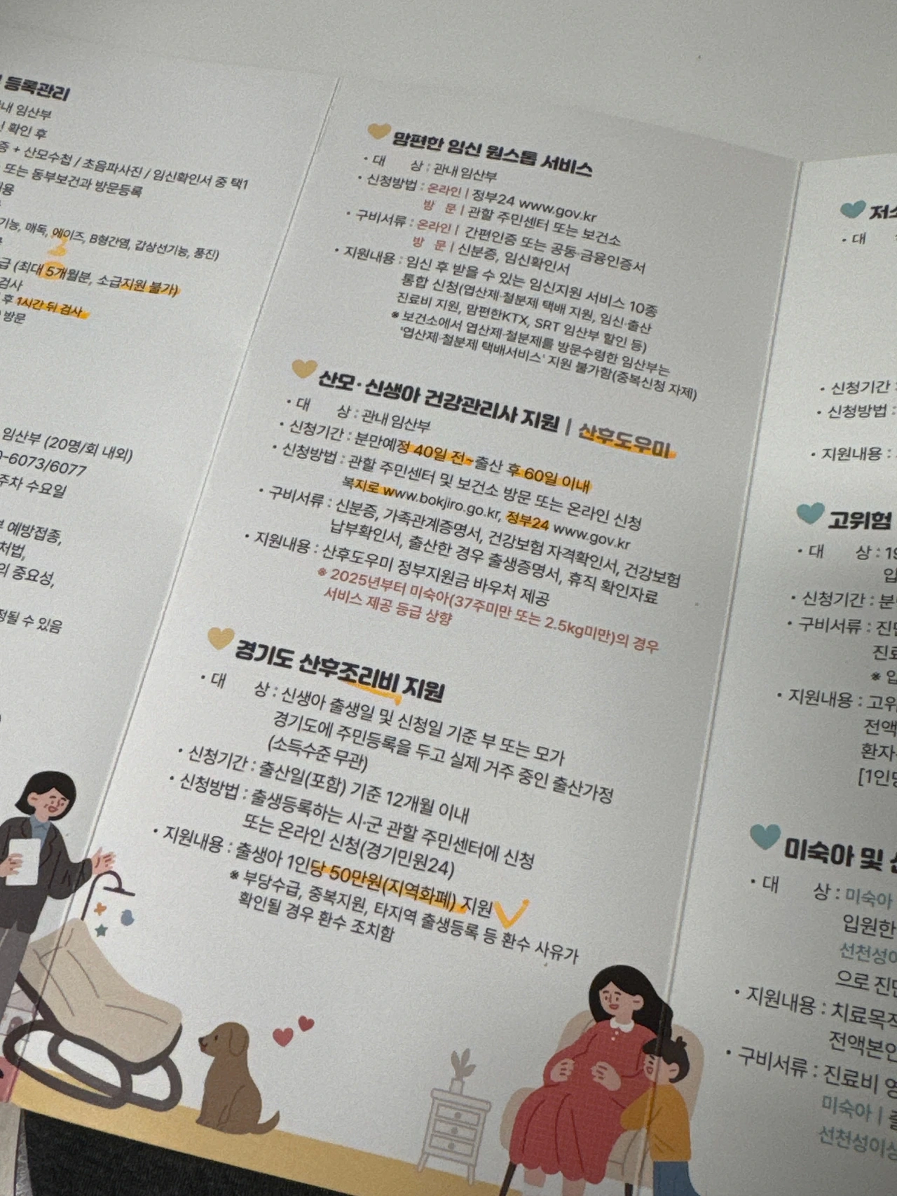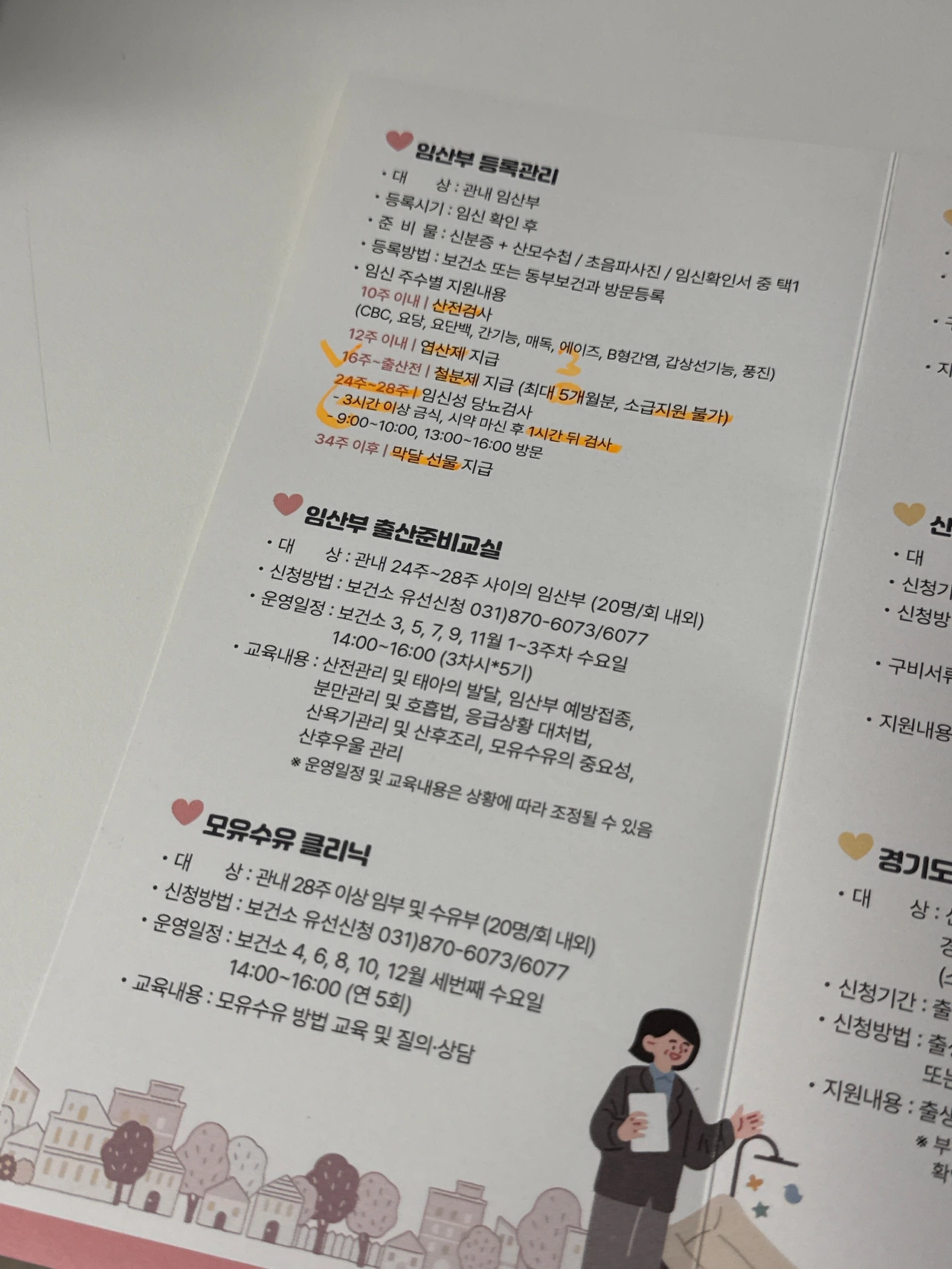 이 외에 검색해 보니 임산부가 받을 수 있는 혜택에는 다양한 것들이 있었다. 예를 들면 스타벅스에서는 임산부에게 커피 쿠폰 2장을 무료로 지원하고, 경기도에서는 임산부를 위한 책 지원사업으로 임신과 육아와 관련한 책 3권을 무료로 지원한다. 각종 영유아 브랜드에서는 예비 소비자들인 임산부들에게 자사 브랜드의 기저귀나 물티슈 등을 모은 첫 만남 패키지 같은 것들을 무료나 혹은 배송비 정도만 받고 지원하기도 한다. 얼마 전에는 비슷한 시기에 임신한 친구가 산모교실에 가면 각종 육아제품을 한 꾸러미 받을 수 있다기에 가서 한 시간 정도 모유수유 수업을 듣고 받아왔다. 손품발품을 잘 팔면 태어날 아기를 위한 각종 생필품 비용을 아낄 수 있다.