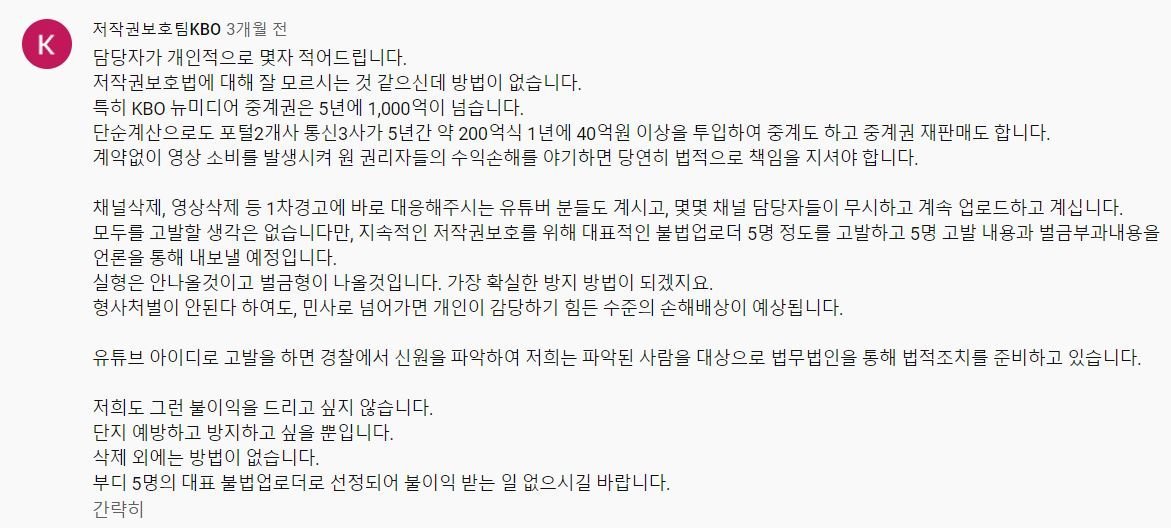 그러니깐 유튜브 및 SNS에 다음과 같은 댓글을 달던 사람들(불법 업로드 영상을 단속하며 고소하겠다고 으름장 놓던 사람들)이 크보 직원이 아니라 크보랑 계약 맺은 어딘가의 대행사 직원이라는 뜻 같았습니다.