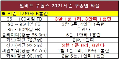 메이저리그 데이터 분석 사이트 '베이스볼 서번트'에 의하면 푸홀스는 올 시즌 95마일에서 100마일(152.8~160.9km) 사이의 패스트볼을 상대로 3할 1푼 1리의 타율을 올리며 1개의 홈런을 쳐냈다. 90마일에서 95마일 사이의 패스트볼을 사앧로도 2할 5푼의 타율과 홈런 하나를 기록했으며, 평균 92.3마일(148.5km)의 싱킹 패스트볼을 상대로도 3할 1푼 6리의 고타율로 좋은 모습을 보였다. 그는 '빠르기만 한' 빠른 공은 물론, 최근 KBO리그에서 유행하고 있는 높은 구속의 변형 패스트볼 또한 쉽게 공략할 수 있는 타자인 것이다. 2020시즌 KBO리그 국내 투수의 평균 구속은 141.8km(88마일)이었으며, 2021시즌 현재도 평균 구속 140km 후반대의 빠른 공을 던질 수 있는 투수는 손에 꼽는다. 푸홀스에게 KBO리그의 패스트볼은 '홈런 치기 딱 좋은 공'에 불과하다.