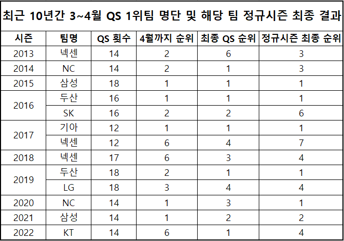 다만 위의 사례들을 그대로 2023년의 키움에 적용하기는 어렵다. 안우진 - 에릭 요키시 - 아리엘 후라도 - 최원태로 이어지는 키움의 선발진이 초가을까지 붕괴하지 않고 유지될지는 알 수 없는 일이기 때문이다. 미래를 알 수는 없는 법이니 이번에도 과거를 통해 몇 개월 뒤를 관측해 보자. 지난 10년 동안 개막 직후 한 달간 QS 1위를 기록한 팀들은 어떻게 정규시즌을 마무리했을까?