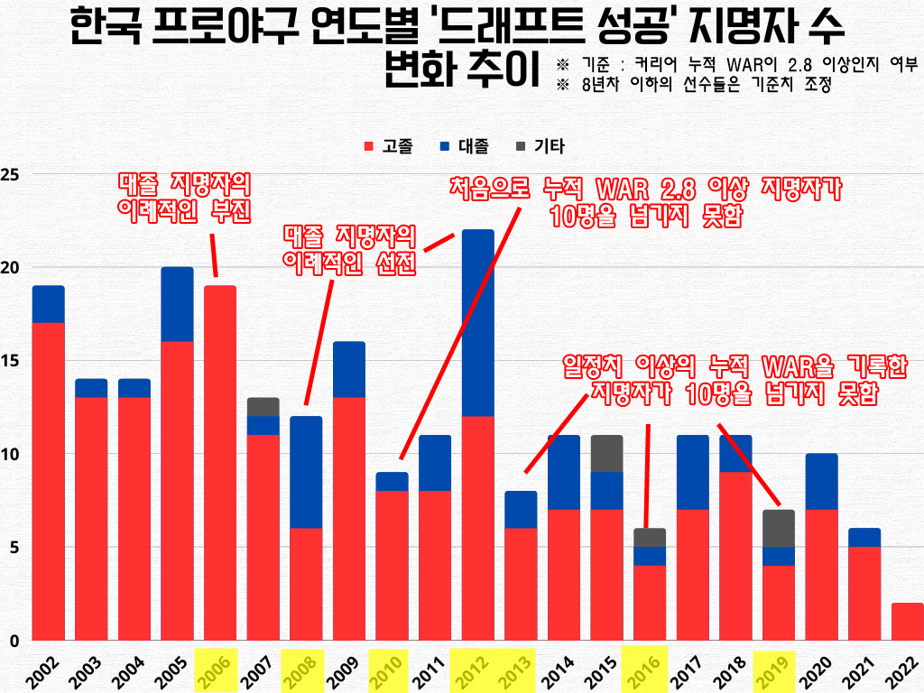 그러니 적어도 KBO리그에서는 0에 가까운 WAR을 기록한 선수 또한 분명 팀에 좋은 영향을 끼치는 선수일 것이다. 다만 기준을 아예 '누적 기여도 0 이상'으로 잡는다면 지명된 이후 1군에서 한 경기도 뛰지 않았던 선수들 또한 전부 집계되고 만다. 그러니 문규현의 sWAR* 0 이상, 1 이하 시즌의 평균치인 0.35를 기준으로 잡았다. 또한 대체선수급 활약을 펼쳐서 '성공했다'라는 평을 받으려면 적어도 문규현처럼 오랜 시간 1군 경기에서 뛰며 가치를 증명해야 한다. 따라서 통산 WAR이 2.8(연간 WAR 0.35 X 8년) 이상인 선수를 '성공한 드래프티'로 설정했다.