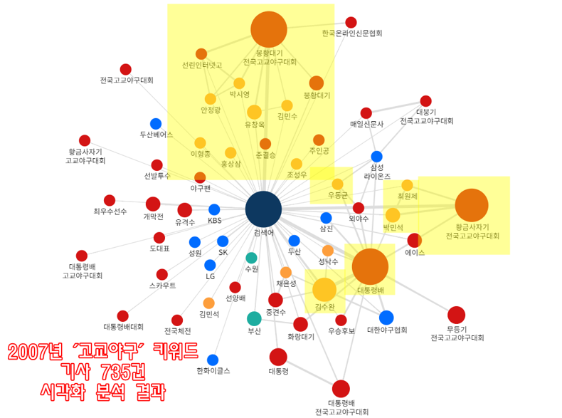 원인을 알아보기 위해 빅카인즈에서 '고교야구'를 키워드로 검색했을 때 나온 2007년 작성 기사 735건을 시각화하여 분석했다. 그리고 '봉황대기 전국고교대회', '황금사자기 전국고교야구대회', '대통령배'라는 거대한 빨간 버블을 중심으로 수많은 선수 이름이 몰려있는 모습을 확인할 수 있었다.