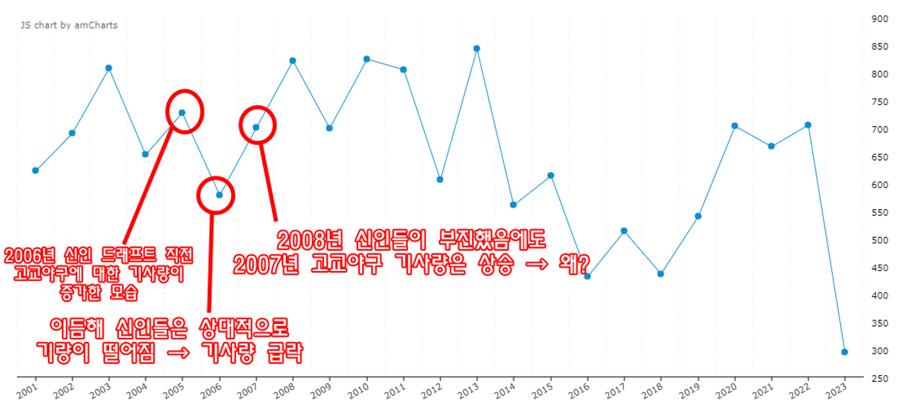 그런데 한 가지 특기할 만한 점이 있다. 2008년 신인 드래프트에서 지명된 고졸 신인들은 오히려 2007년 드래프티보다 부진했다(누적 sWAR 2.8 이상 2007년 11명 → 2008년 6명). 그런데 해당 선수들이 고등학교 3학년이었던 2007년에는 오히려 기사량이 상승했다. 어째서일까?