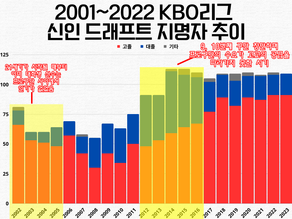 KBO리그의 아홉 번째 프로야구단 NC 다이노스가 창단함으로써 신인 선수의 양적 수요가 높아진 2012년에는 많은 수의 대졸 선수들이 지명됐으며, 이들이 좋은 성적을 올리기도 했다. 이는 2012년 대학야구를 다루는 기사의 수가 매우 큰 폭으로 급증하는 결과를 낳았다. 하지만 2012년 이후 대학야구에 대해 다루는 기사의 수는 꾸준히 줄어들었다. 대졸 선수들이 2008년, 2012년 신인 드래프트와 같은 '이변'을 연출하지 못했기 때문이다.