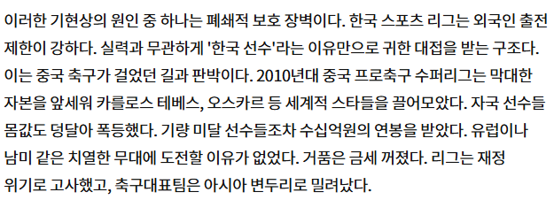 해당 기사의 바이라인에 이름을 올린 기자님은 야구보다는 축구 분야의 전문성이 훨씬 높은 것으로 보인다. 축구 전문 기자님이 '국제 경쟁력 떨어지는 한국야구'를 주제로 기사를 쓰실 수 있다. 하지만 타 종목의 문제 해결법을 KBO리그에 그대로 가져다 대면 곤란하지 않나? (※ 물론 K리그를 KBO리그와 비슷한 수준으로 흥행시키는 방법 또한 '외국인 선수 출전 제한 폐지'는 아닐 것이다.)