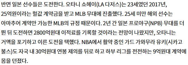 이어지는 내용은 황당한 수준이다. 일본 야구선수들도 경제적 요소를 고려하며 미국 무대에 도전장을 내민다. 지난겨울 포스팅을 신청한 오카모토 카즈마와 이마이 타츠야는 각각 4년 6000만 달러, 3년 5400만 달러에 MLB 구단과 계약을 맺었다. 시카고 화이트삭스와 계약한 무라카미 무네타카는 팀에서 2번째로 높은 연봉을 받게 됐다. 반면 다카하시 코나는 기대에 못 미치는 계약 제안을 받자 미국행을 포기했다.
