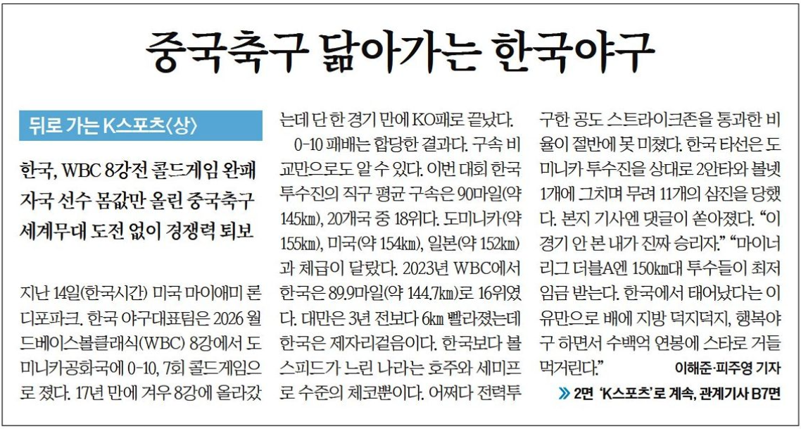 오늘(2026년 3월 16일자) 중앙일보 1면에 WBC 8강전 참패를 당한 한국야구를 꼬집는 기사가 실렸다. 수년째 답보 중인 국내 투수들의 구속 문제를 꼬집는 대목은 합당한 지적이다. 국내파 투수들의 구속 문제는 지난 WBC 당시부터 심각한 문제로 지적받아 왔다. 일간스포츠의 야구 전문 기자였던 최민규 한국야구학회 이사는 최근 <시사IN> 기고를 통해 국내파 투수들의 전반적인 구종 완성도가 떨어진다는 점을 지적하기도 했다.