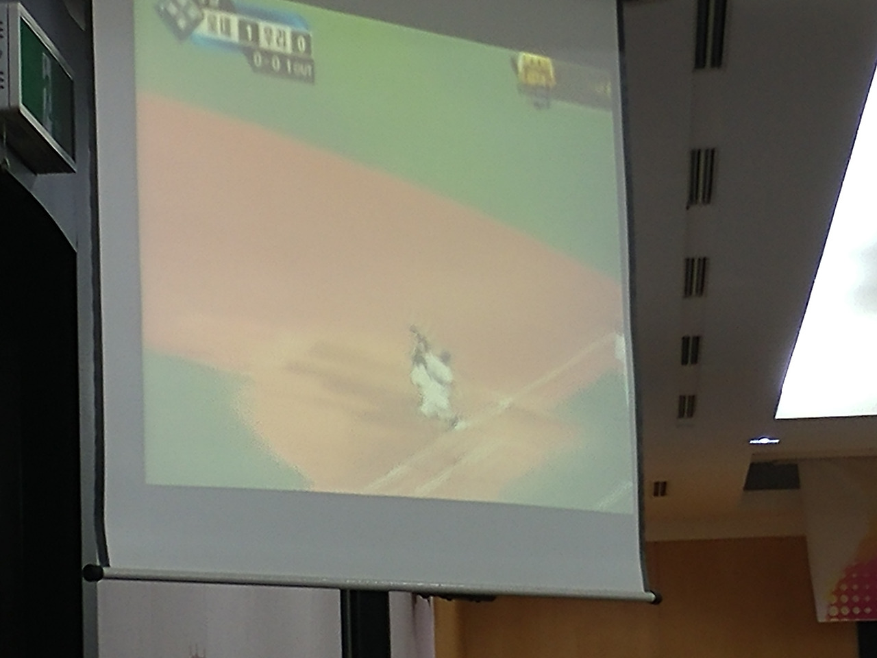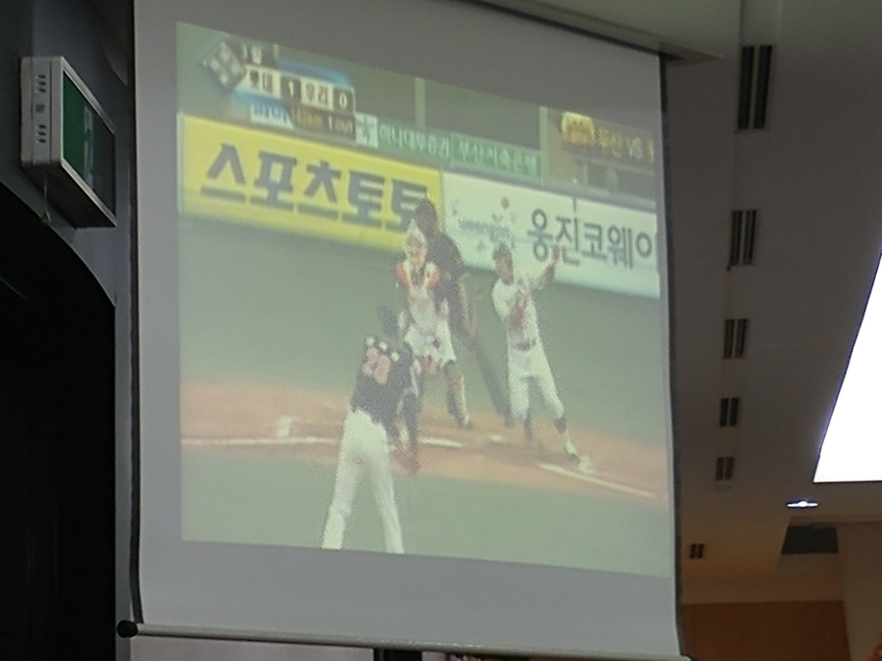 경기 중간에 유인물에는 LG 1루수가 땅볼 타구를 아웃으로 처리하지 못한 뒤 윤대영으로 교체된다고 적혀있던 게 영상에서는 김현수선수가 타구를 잡은 뒤 넘어져서 송구에 실패하고 발목 부상으로 교체되는 것으로 나와서 깜짝 놀랐는데, 알고보니 수업에서 사용된 가상 경기가 작년 9월 4일 수원 LG - KT전을 베이스로 만들어진 것이었다.