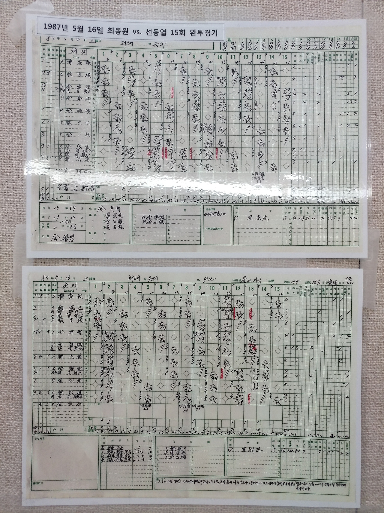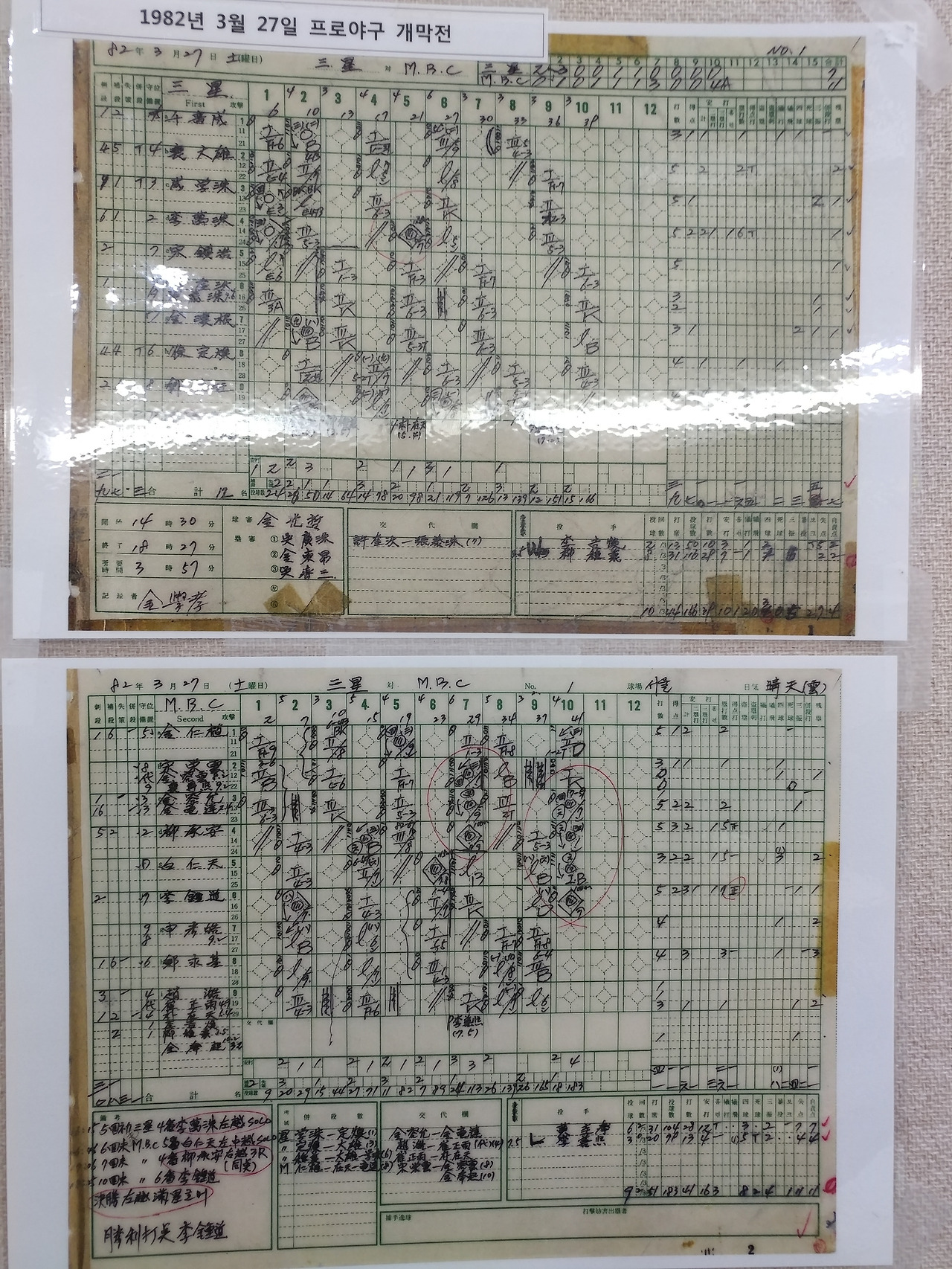 어제부터 강의실 벽에 일정한 간격으로 붙어있는 종이들이 뭔가하고 신경 쓰였는데, 오늘 쉬는 시간에 슬쩍 보니 프로야구 개막전, 최동원-선동열 간의 전설의 맞대결, 등등 전설적인 경기들의 기록지들을 찍어놓은 것이었다. 한자가 가득하길래 내 한자실력으로는 기록원이 되기에는 턱도 없겠구나! 싶었다.