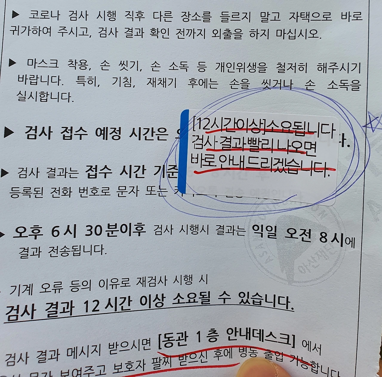 병원에서 코로나를 검사했다.병원은 코로나 때문에 보호자를 엄격하게 통제했다. 코로나 때문에 폐쇄된 응급실 앞에서 아버지와 구급차를 타고 하염없이 기다렸던 일을 떠올리면 당연한 조치라고 생각했다. 보호자가 견디기 힘들 정도로 상주, 면회, 교대, 외출을 통제했다. 인터넷에서 보호자가 환자를 자유롭게 볼 수 없고 환자가 외롭게 투병하는 사연이 많았다. 아산병원은 예외적으로 코로나 음성이 확인된 보호자 한명만 상주를 허용했다. 이러한 경우에도 병원에 출입하기 2일 이내에 실시한 코로나 결과만 인정했다. 미리 집근처 선별진료소나 보건소에서 검사를 받으면 좋겠지만 병원 검사소에서 검사를 할 수도 있었다. 응급실 앞 가건물에는 보호자들이 검사를 받으려고 줄서서 기다렸다. 비용은 환자는 1만원, 보호자는 9만원 정도였고 검사 결과가 나오기까지 최대 8시간 정도 걸렸다. 상주보호자 출입증은 환자와 동일한 팔찌로 발급되었다. 예전 출입증은 목걸이라서 보호자들이 병원에 알리지 않고 몰래 교대를 했던 것 같았다. 보호자 교대는 불가피한 사정이 있으면 1회만 허용되는데 병동마다 상이해서 간호사실에 사전 확인할 필요가 있었다. 병원은 코로나 지침을 위반하는 보호자를 퇴실시키고 전산으로 출입을 제한하기 때문에 보호자는 1인만 상주하고 교대시 출입증을 반드시 반납해야 했다.