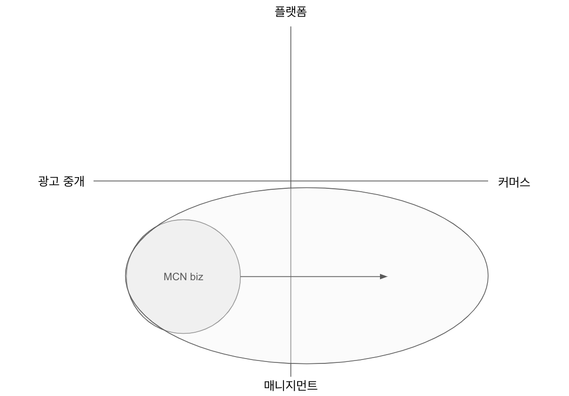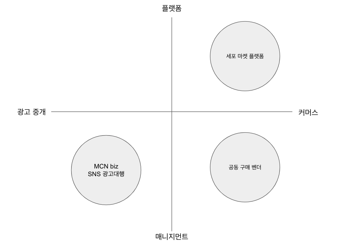 하단의 그림처럼 한 개의 가로축은 해당 비즈니스가 광고 중개(협찬) 모델을 지향하는가, 실물 거래의 커머스 모델을 지향하는가?를 나타내는 정도이고, 다른 한 개의 세로축은 해당 비즈니스의 기본 구조가 플랫폼인가, 기획사 같은 매니지먼트인가?를 나타내는 정도입니다. 이렇게 나눠보니 복잡하게만 다가왔던 시장의 모습을 각 영역별 구체적인 플레이어를 연상할 수 있을 만큼 명쾌히 정리할 수 있어 좋았습니다. 그래서 이러한 프레임을 바탕으로 가볍게 정리한 생각을 적어볼까 합니다. :)