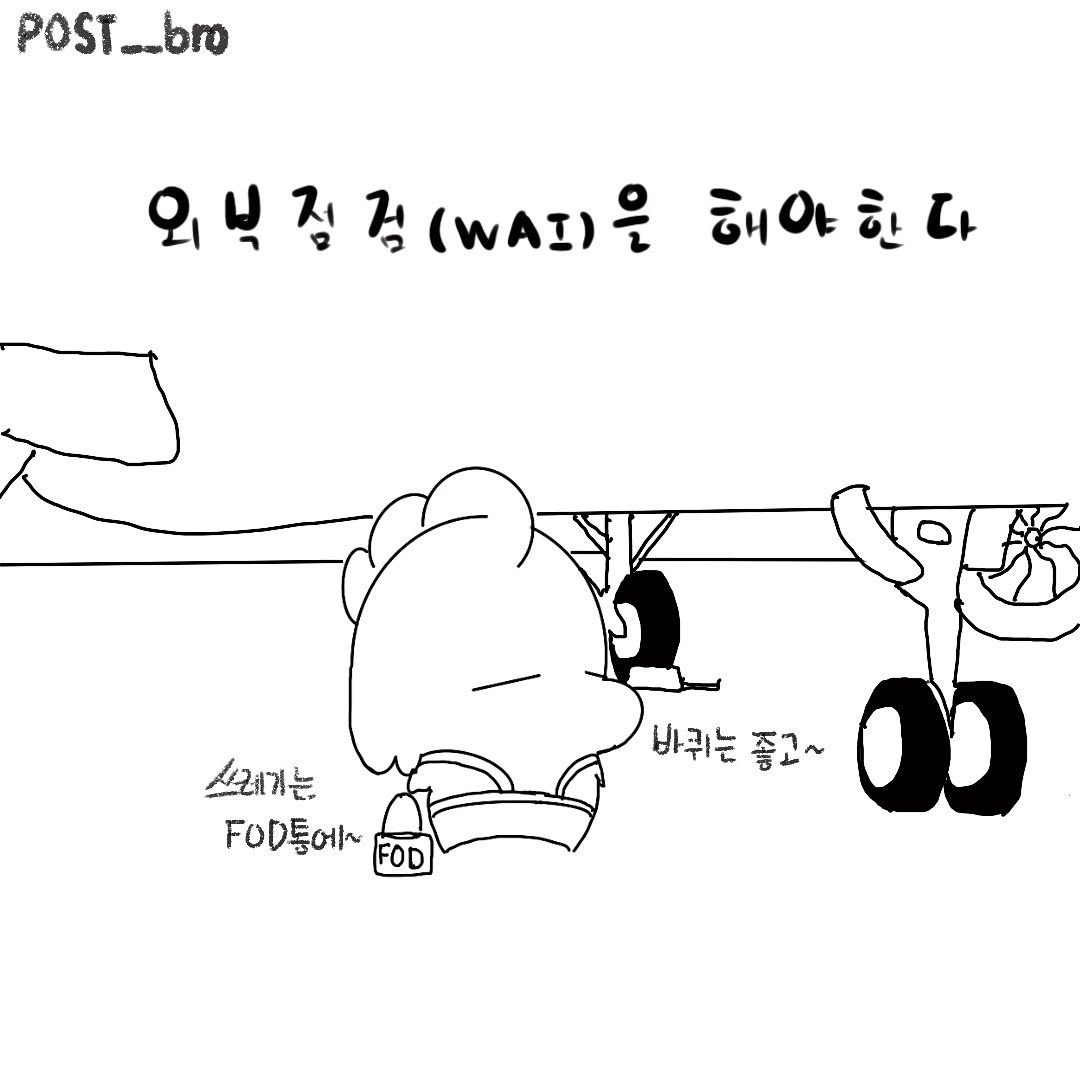 비행기를 돌면서 주요 외관 손상 여부, 누유 여부와 작동상태를 확인해야 한다.