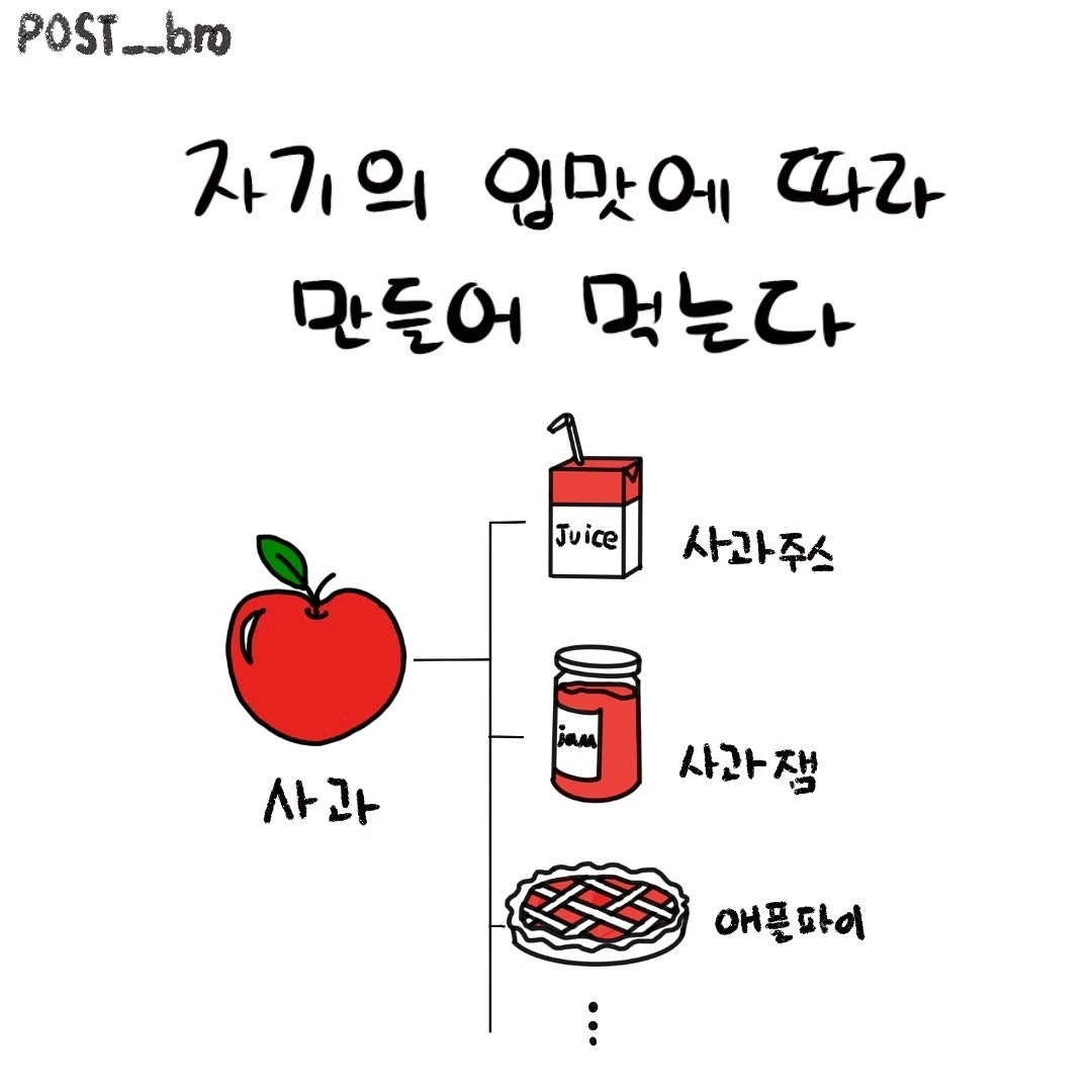사과주스, 사과잼, 애플파이, 사과 사탕 등 다양하지만 하나의 사과인 것처럼