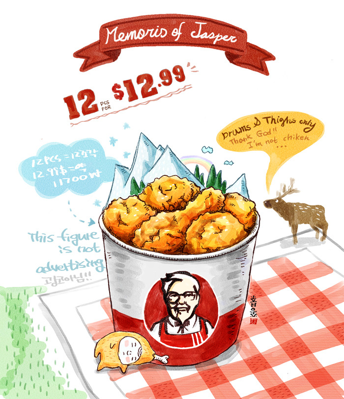 한국과 비교할 수 없는 저렴한 가격에 어마 어마 한 양의 치킨을 제게 안겨 주었습니다. 치킨 조각의 크기도 정말 크더군요. 정말 바보처럼 웃으면서 강아지처럼 먹었습니다. 한 동안 기름 냄새가 싫을 정도로 말입니다. 앞으로도 제스퍼에 가게 된다면 꼭 치킨을 먹겠습니다.