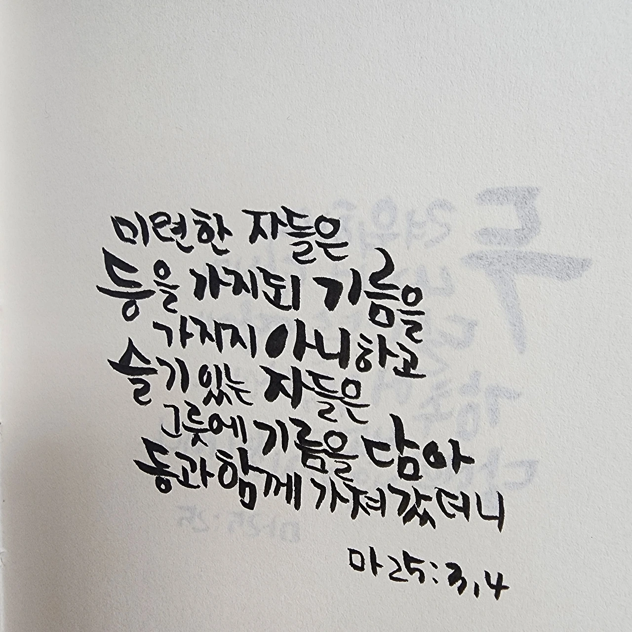 캘리를 배우며 캘리 선생님이 해주셨던 말씀이 기억난다. 믿음이 성장할 때 가장 좋은 건 누군가의 선생님이 되는 것.. 교사가 되어서 그 자리에 서는 것이 중요하다고 하셨다. 그래서 나는.. 저는 너무 아는 게 없고 믿음이 작은데 어찌 아이들의 교사가 되냐 물으니. 선생님의 자리에 서면서 그 부족함이 보일 때 계속 기도하면서 배우면서 나아가면 된다고 했다. 어느 누구도 완벽하지 않고 다 알 수 없다고 완벽할 때 선생님이 되려고 하는 건 아니다고 얘기하셨다.