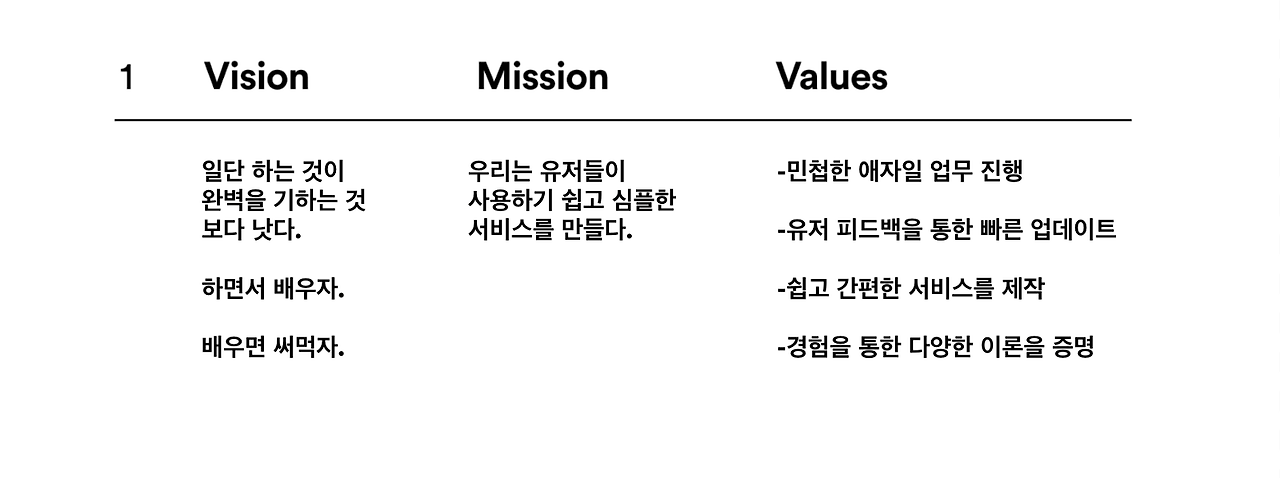 각자 회사를 다니면서 배운 점과 적용해보고 싶은 다양한 방법론을 알고 있어도 회사의 비전 혹은 예산문제 등 다양한 벽에 부딪혀서 실천해 보기가 쉽지 않았다. 그래서 시작하게 된 Thursdayship의 비전과 미션, 가치는 이러했다.