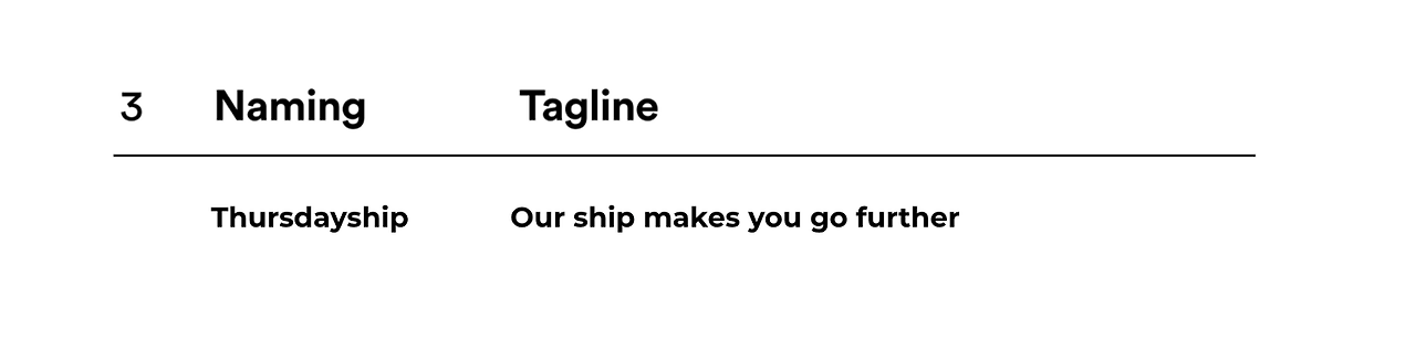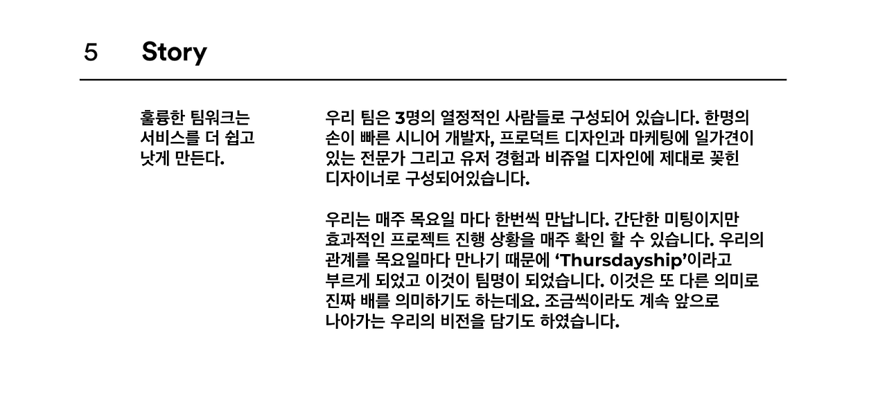 다섯 번째로 스토리이다. 이것은 브랜딩을 하는 데 있어서 여러 가지 제작물로 사용될 수 있다. 일단 Thursdayship의 가장 큰 장점이 팀워크라는 점을 생각하여 풀어낼 수 있는 브랜드 스토리를 적어보았다. 이 스토리는 웹사이트, 동영상, 소셜미디어 짤 같은 것들로 풀어질 수 있다.
