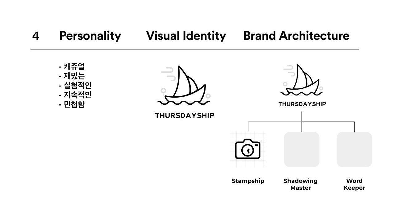내가 속해있는 디지털 스튜디오 팀 Thursdayship 브랜드 아이덴티티 디자인을 어제 막 마무리하게 되어서 이 과정을 소개해보려고 한다. 당장 로고부터 디자인하기 시작하면 나중에 마주하게 되는 이런 질문 ‘예쁘긴 한데… 우리 브랜드의 색깔과 맞는지 잘 모르겠어요. 왜 이렇게 디자인하였나요?’에 대답을 하지 못하게 된다.