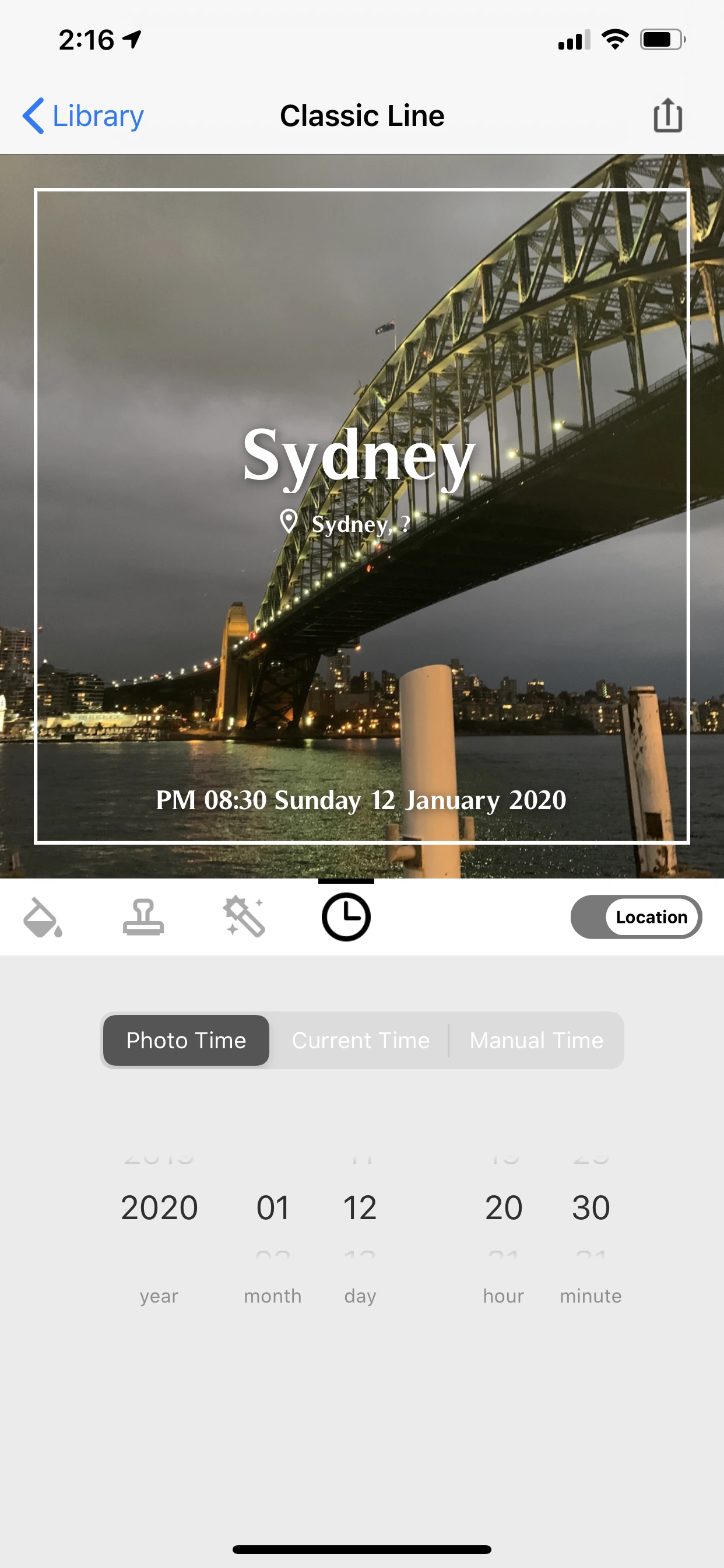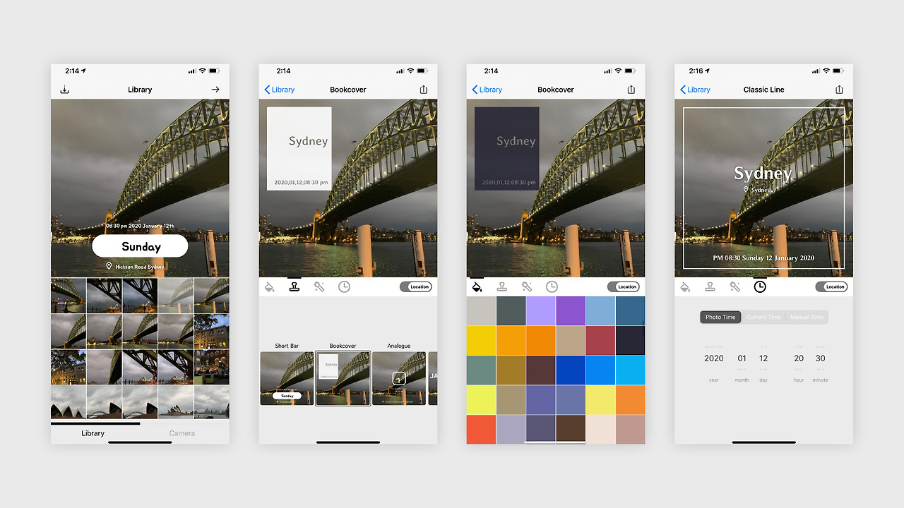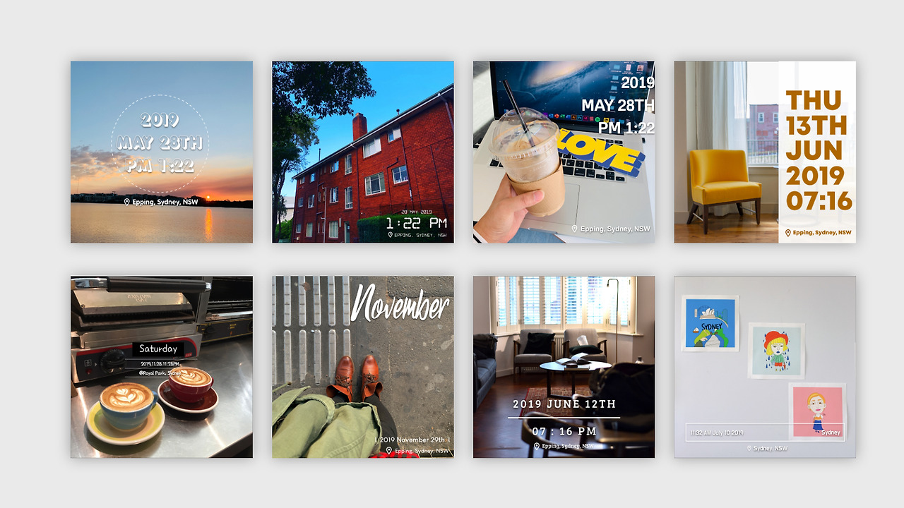 앱의 플로우는 간단합니다. 찍은 사진을 내가 원하는 타임&로케이션 스탬프를 골라서 저장하면됩니다.