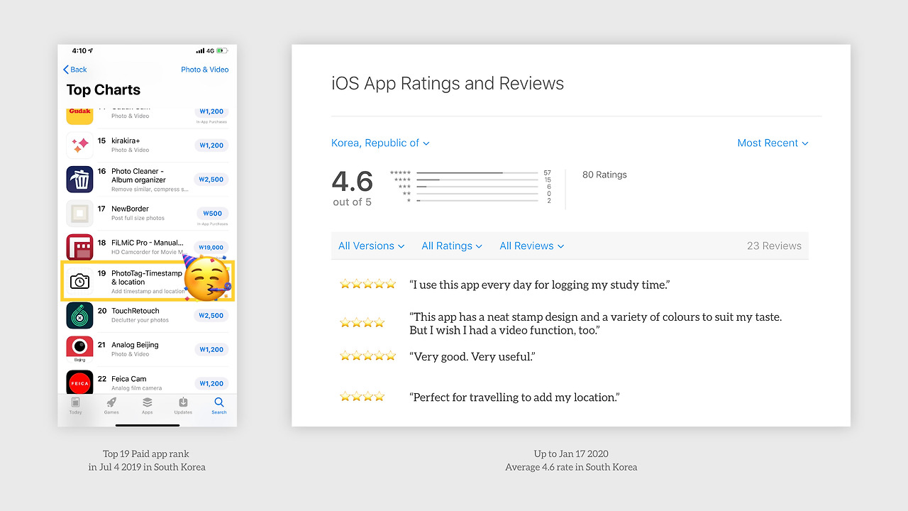 올해는 Top 10안에 들어가 보고 싶은데요! 많은 분들이 생각보다 사랑해주시고 리뷰를 많이 남겨주신 만큼 더 발전하는 Phototag 가 되보겠습니다.