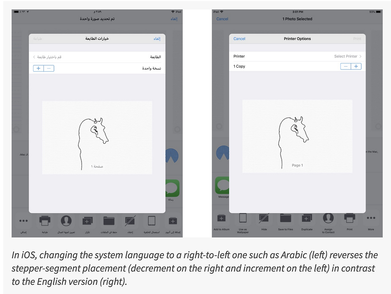 인풋 스탭퍼는 명시적인 기호이다. 더하기 요소는 오른쪽 또는 위에 위치하고 빼기 요소는 왼쪽 또는 아래에 위치한다. 이런 위치 배정은 자연스러운 은유를 담고 있는데 왼쪽에서 오른쪽으로 진행되거나 많아지면 올라가고 적어지면 내려간다는 의미를 담는다. 하지만 언어 또는 문화적인 배경에 의해 이 메타포가 반대로 적용되는 경우도 간혹 있다. 아랍 지역에서는 왼쪽에서 오른쪽이 아닌 오른쪽에서 왼쪽으로 읽히기 때문에 반대로 표시해야 한다.