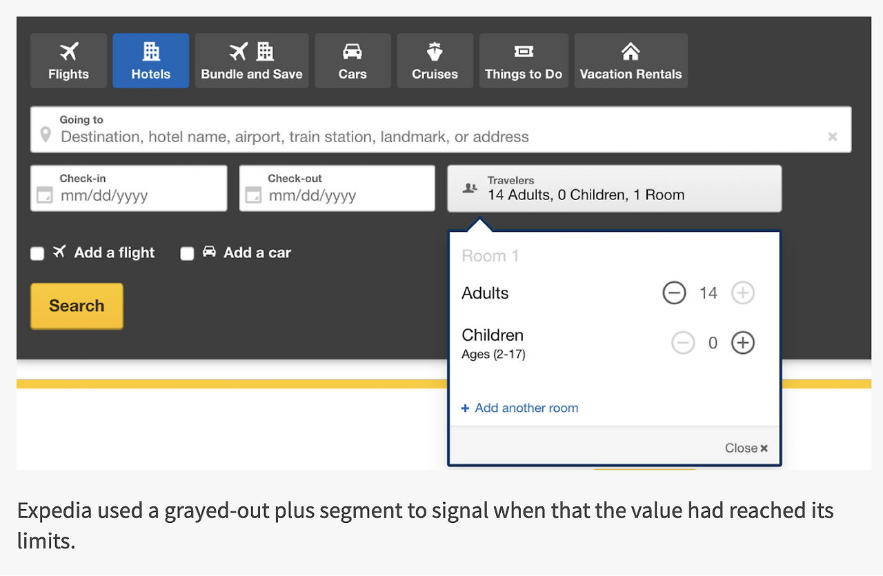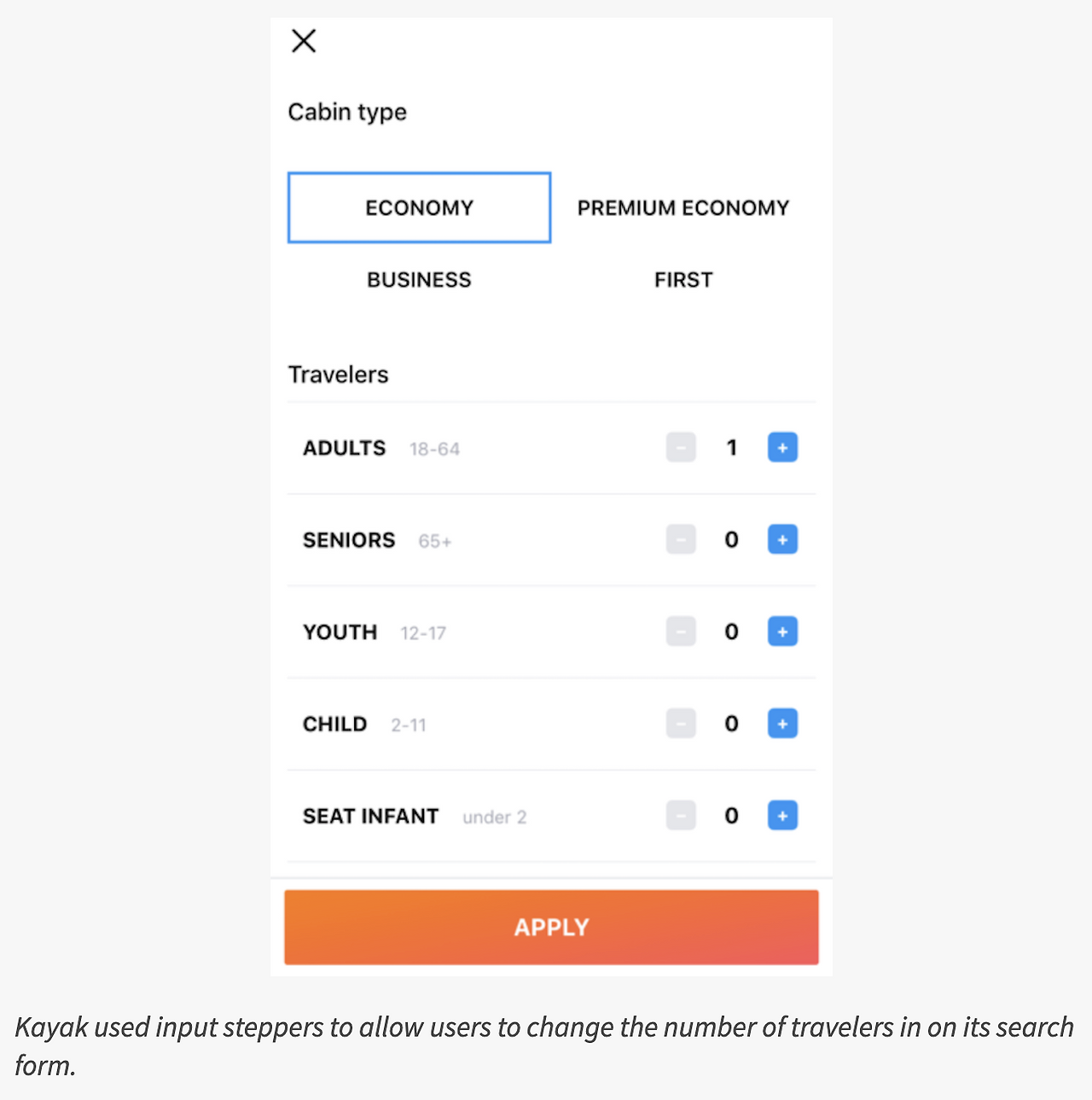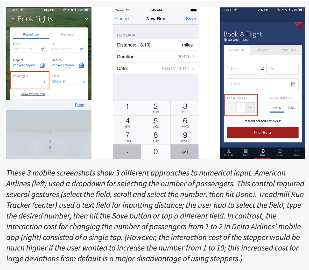 작은 숫자 같은 것을 입력할 때 스태퍼는 조금의 노력으로 쉽게 입력할 수 있는 방법이다. 예를 들어 승객 1 명 또는 2명을 선택하는 폼에서 사용자가 플러스 버튼을 누르기만 하면 되기 때문이다. 키보드 또는 슬라이더를 사용해야 한다면 숫자를 선택하고 엔터키를 눌러야 하고 다시 적으려면 delete버튼을 눌러야 해서 번거롭다.