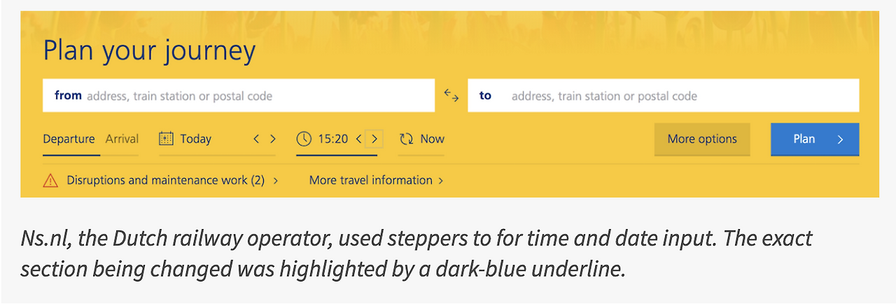 -확실하게 어떤 부분이 스태퍼인지 보여줘야 한다. 분명하게 어떤 부분이 스탭퍼인지 알려줘야 한다. 예를 들어서 만약 스태퍼 컨트롤러가 시간과 날짜를 변경하게 하는 곳에 위치한다면 어떤 컨트롤러가 시간이고 날짜인지 분명하게 표시해줘야 한다. 사용자가 날짜를 조정하고 있는지 시간을 조정하고 있는지 알고 조정할 수 있어야 하기 때문이다.