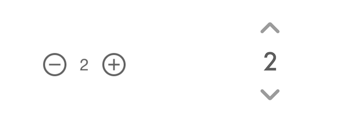 - + - 또는 업 다운 버튼을 시각화해라. 가로형 스태퍼의 경우 더하기 빼기 기호를 사용하는 것이 적절하다. 세로형 스태퍼의 경우 상향꺽쇠 하향꺽쇠를 사용하는 것이 적절하다.