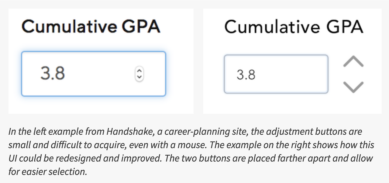 피츠 법칙에 따르면 선택하려는 버튼이 클수록 빨리 선택할 수 있다는 것이다. 그러나 많은 인풋 스태퍼들은 대부분 작다.