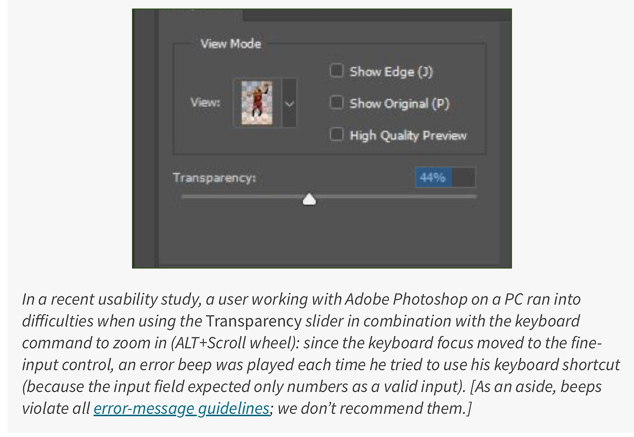 연결된 컨트롤을 쉽게 사용 할 수 있도록 만들려면 사용자가 대략적인 값을 슬라이더로 조정하며 탐색할 때 키보드 포커싱은 텍스트박스에 위치해야한다. 이렇게 포커싱 되어 있으면 더 쉽게 원하는 값이 얼마인지 알고 텍스트 필드에 그 값을 입력 할 수 있게된다. 이렇게 포커싱 되어있다면 마우스로 텍스트박스를 클릭하고 다시 슬라이더를 클릭하는 등의 비효율적으로 조작하는 시간을 줄일 수 있게된다.
