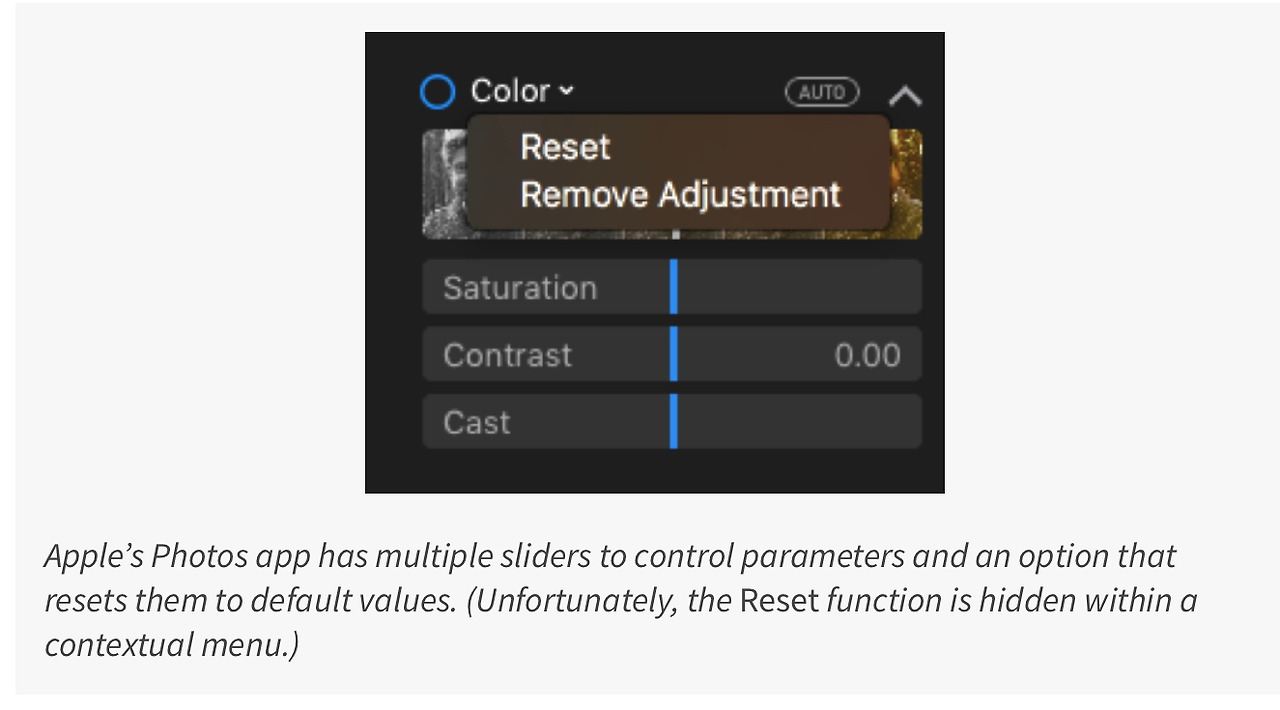 좋은 기본 값은 중요하다. 사용자의 시간과 노력을 절약할 수 있을 뿐만 아니라 초기사용자에게 가이드 값으로 제공되기도 한다. 전형적인 기본값은 중립의 상태를 나타내는 것으로 적용된다 예를 들어 줌 슬라이더의 경우 기본값은 100%로 설정되어 있고 슬라이더가 중간에 위치하게된다. 그리고 예를 들어 리셋버튼 처럼 기본값으로 돌아갈 수 있는 쉬운 방법을 제공한다. 이런 리셋 버튼 같은 것은 특히 중립값이 중간에 위치하는 경우라면 더욱 유용하다. 리셋버튼이 없다면 기본값으로 돌아가기위해 중간위치에 다시 두는 것이 번거롭기 때문이다. 또는 기본값의 범위가 0-100부터 시작하는게 아닌 경우, 초기 사용자가 기본값을 알기 어려운 경우 리셋버튼 처럼 기본값으로 돌아갈수있는 버튼이 추가되어야한다. 또 다른 도움이 되는 기본값을 나타내는 요소로는 시각적으로 기본값을 표시해두는 것이다. 예를 들어 작은 틱표시 또는 해시마크를 슬라이더 위에 넣어 기본값의 위치를 볼 수 있도록 적용한다.