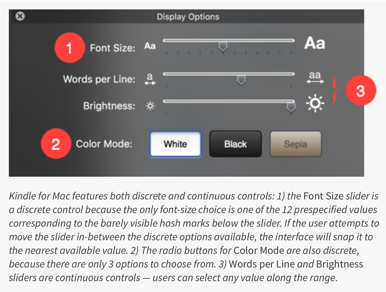 - 개별 조정 : 개별 조정이란 제한된 숫자단계 또는 옵션이 제공되어 조정하는 것이다. 예를 들어 아래 이미지 킨들의 맥디바이스 폰트 사이즈 컨트롤러 킨들의 화면 조정 기능을 보면 12개의 세팅된 단계별 값을 슬라이더로 조정 할 수 있고 각 단계는 슬라이더 밑에 마커로 표시되어있다.