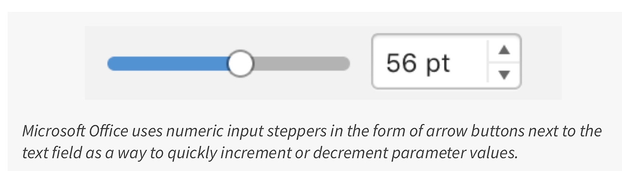 정밀한 값을 조정하는 가장 간단한 방법은 텍스트 인풋 박스를 사용해서 사용자가 정확한 값을 입력하도록 하는 것이다. 그러나 이 해결책은 정확한 값을 입력하도록 하게 할 수는 있지만 사용자가 효율적으로 조절 할 수 있는 범위의 값들을 탐색할수는 없다. 만약에 당신이 미리 값을 알고 있다면 타이핑하면 되지만 만약 당신이 어떤 숫자를 입력해야 원하는 값을 얻을 수 있는지 모른다면 아무 값이나 넣고 원하는 결과나오는지 랜덤하게 추측해야하고 추가로 스탭퍼 버튼이 있어서 값을 올리고 내릴 수 있더라도 비효율적이다. 더 나아가 텍스트 박스는 입력가능한 범위의 값을 보여주지 않는다 (예를 들어 RGB컬러는 0-255까지 입력이 가능하지만 새로운 사용자에게는 원하는 색을 만들기 위해 숫자를 입력하는 것이 직관적이지 않다. )