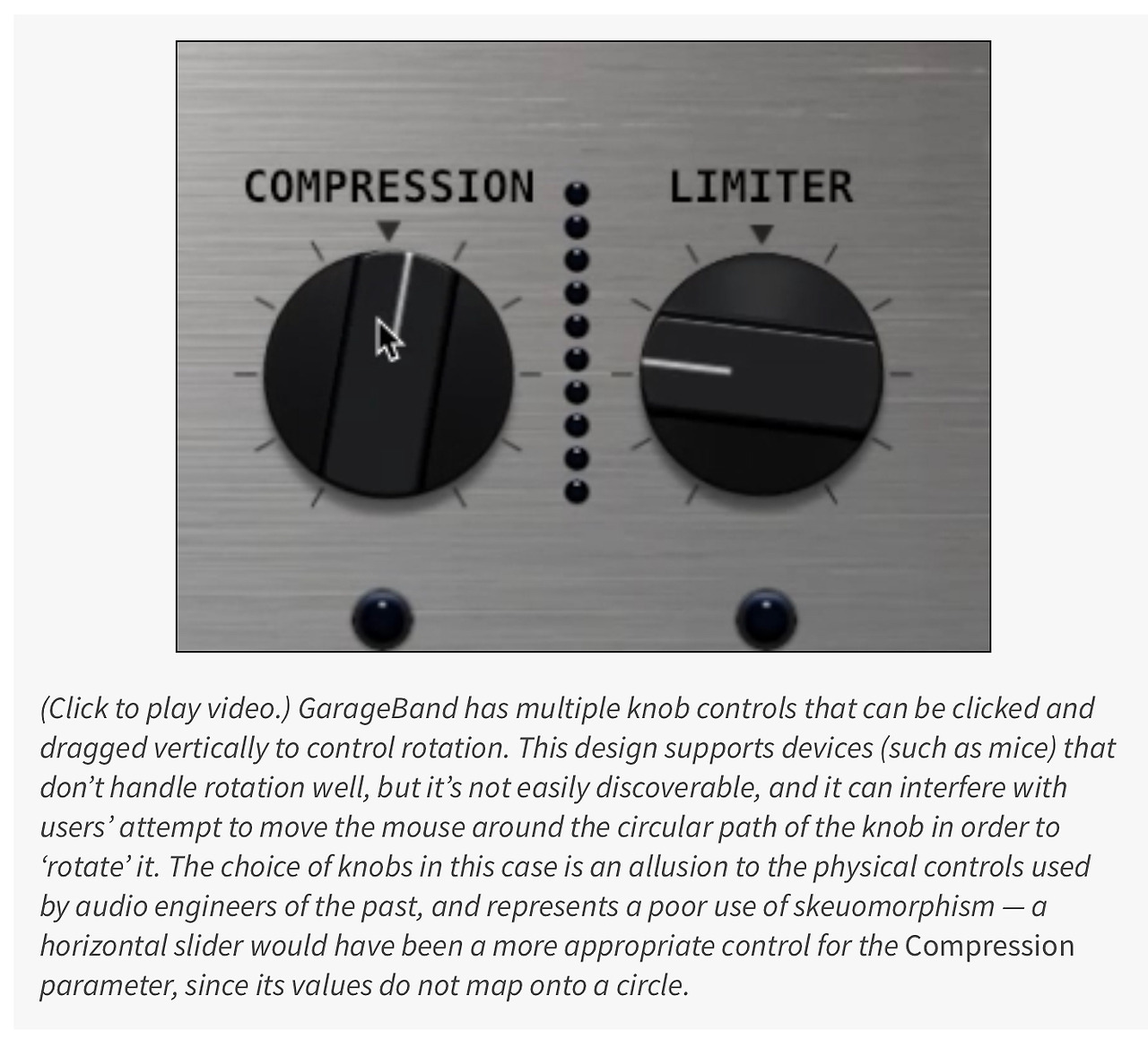 가상 노브의 경우 사용자가 반드시 '돌려서'사용해야하는 것으로 자연스럽게 값이 조정됨을 표현한다. 오디오 엔지니어가 소리를 왼쪽에서 오른쪽 스피커로 이동시켜야 할때 또는 오디오를 믹싱해야 할때 적용되는 컨트롤러를 떠올리면 된다. 그러나 가상 노브는 물리적인 제한이 있는데 마우스나 트랙패드같은 일반적인 입력 장치로 조작하는데 어려움이 있다. 회전시키는 어포던스가 마우스와 트랙패드에 없기 때문이다. 간혹 어떤 노브 디자인은 숨겨진 드래그 방법으로 사용자가 클릭하여 드래그를 위 아래로 수직선형으로 하게되면 값이 증가하고 감소할 수 있도록 지원하기도 한다. 그러나 이런 행동을 할 수 있다고 기대되지 않고 이렇게 해야한다고 표기되어 있지 않기 때문에 많은 사용자들은 숨겨진 드래그 노브 조작 방법을 알아챌 수 없다. 덧붙여 대충 적용 경우에는 노브를 마우스로 원형으로 드래그해서 돌리게 하는 것인데 원형으로 드래깅을 한다는 것은 어렵다.